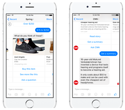 Facebook Messenger od niedawna umożliwia interakcję z botami, jest ich więc jeszcze stosunkowo niewiele. Można wśród nich znaleźć m.in. boty CNN, 1-800-Flowers (usługa do zamawiania kwiatów), Spring czy HP. Po rozpoczęciu rozmowy udostępniają one możliwe komendy w postaci przycisków, nie ma więc konieczności ręcznego ich wpisywania. Niektóre chatboty, jak np. Spring, umożliwiają również zakupy bezpośrednio z poziomu rozmowy.