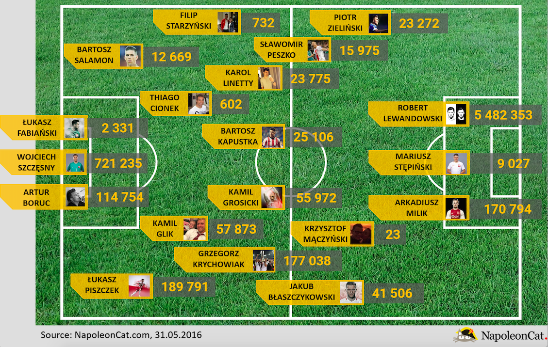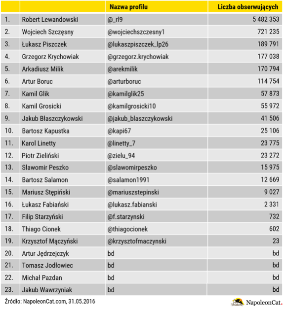 Na infografice umieszczone zostały dane dla piłkarzy, którzy posiadają profile na Instagramie (niekoniecznie oficjalne). Nie zostali tu zatem umieszczeni zawodnicy: Artur Jędrzejczyk, Tomasz Jodłowiec, Michał Pazdan, Jakub Wawrzyniak (brak profili na Instagramie). Ustawienie “zawodników” – przypadkowe.