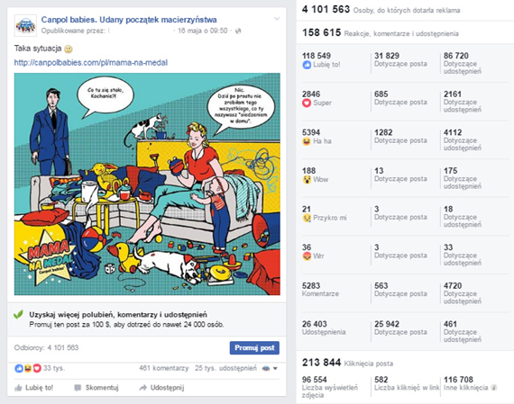 Kampania trafia w czuły punkt, jakim jest poczucie dowartościowania u młodych matek. Grafika opublikowana na fanpage’u Canpol babies obrazująca główny problem poruszany w ramach kampanii stała się wirusowym memem, który w niespełna 3 dni dotarł organicznie do ponad 4 000 000 użytkowników Facebooka.