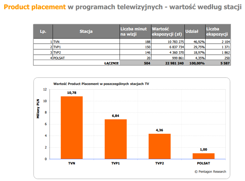Najwięcej czasu lokowaniu produktów poświęcono w stacjach TVN i TVP1, a najmniej w Polsacie. 46% przypadało na produkty żywnościowe, 15% na rozrywkę i kulturę, 12% związane ze sprzedażą 46% wartości stanowiły ekspozycje w charakterze scenografii, 43% używane przez aktorów lub prowadzących program (aktywne). Ponadto informacja o produktach w postaci logotypów lub napisów pojawiała się pod koniec programów.