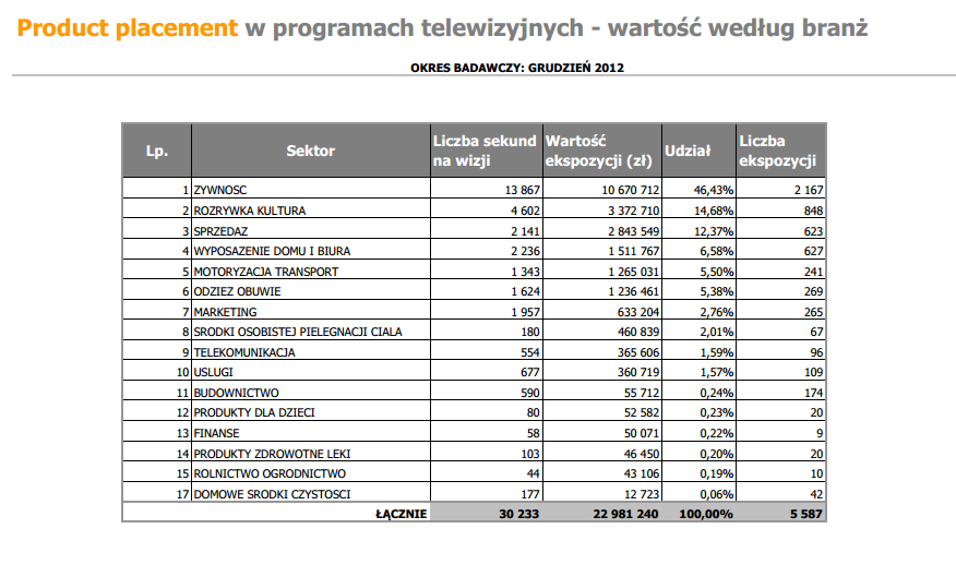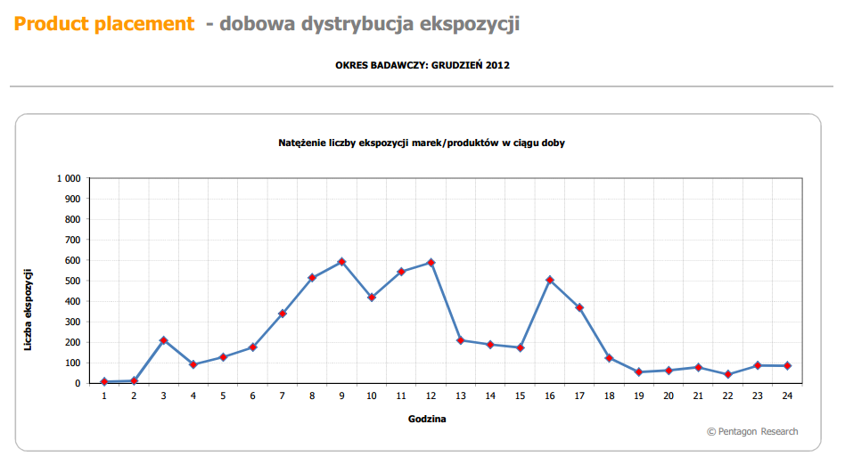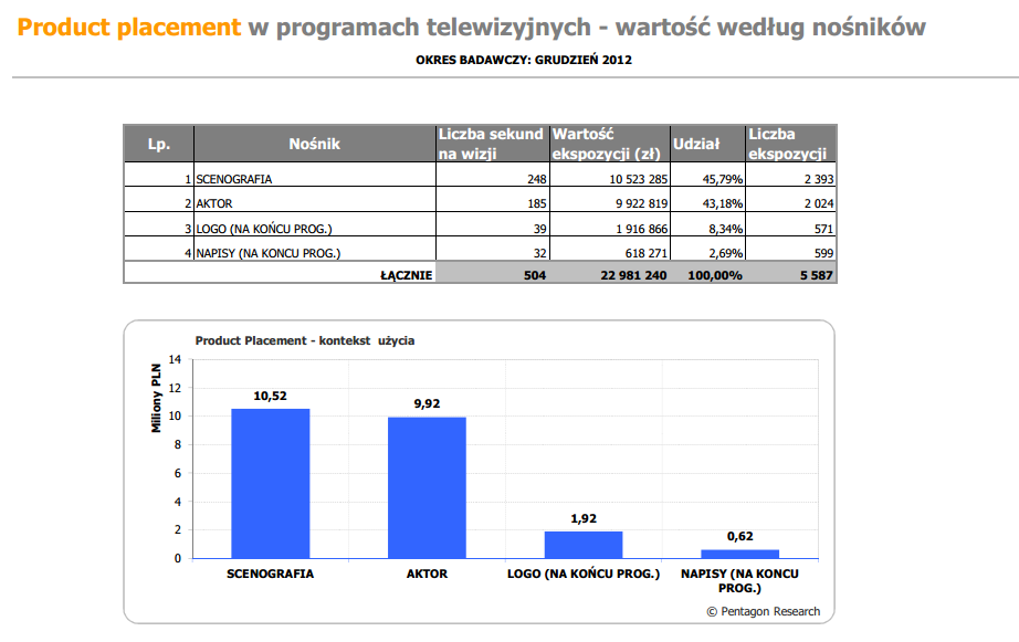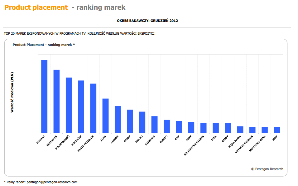 Badanie zostało przeprowadzone przez Pentagon Research w dniach 1-31 grudnia 2012 w pasmie 24h w stacjach TVP1, TVP2, TVN, POLSAT. Zbadano emisje premierowe wraz z powtórkami. W tym okresie zanotowano wystąpienie 319 marek, o łącznej długości na wizji 8,4 godzin.