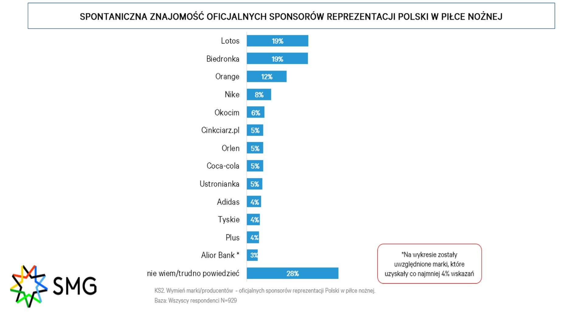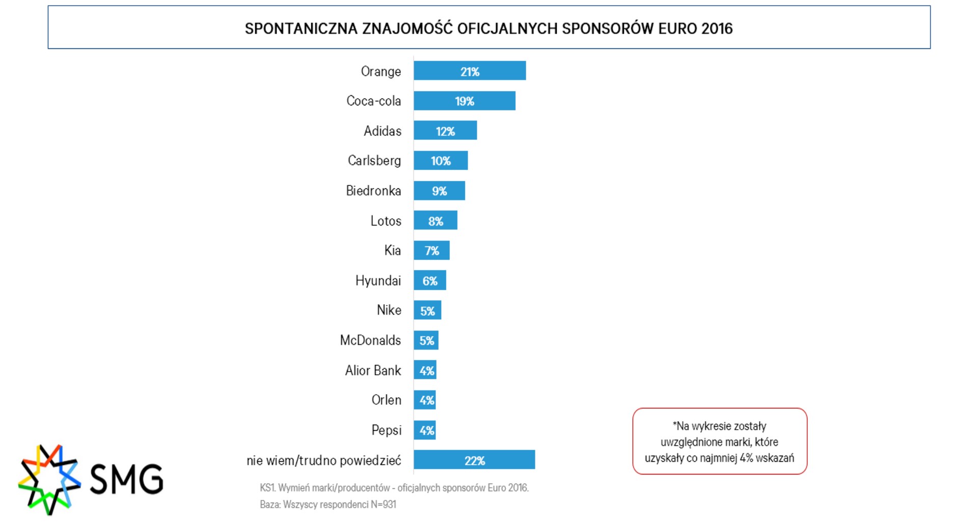 Tuż przed rozpoczęciem Mistrzostw Europy w piłce nożnej żadnego z dziesięciu oficjalnych sponsorów Euro 2016 (Coca-Cola, Orange, Kia, Hyundai, Adidas, Carlsberg, McDonalds, Turkish Airlines, Continental, Hisense, Socar) nie potrafiło spontanicznie wymienić 22 proc. respondentów. Najwięcej wskazań (21 proc.) zebrała marka Orange, następnie Coca-Cola (19 proc.), Adidas (12 proc.), na kolejnych miejscach znalazły się: Carlsberg (10 proc.), Kia (7 proc.), Hyundai (6 proc.) i McDonalds (5 proc.). Wśród oficjalnych sponsorów Euro 2016 wymienianych przez Polaków dosyć wysoko uplasowały się również marki Biedronka (9 proc.), Lotos (8 proc.) oraz Nike (5 proc), które są związane marketingowo z reprezentacją, a nie Euro 2016.