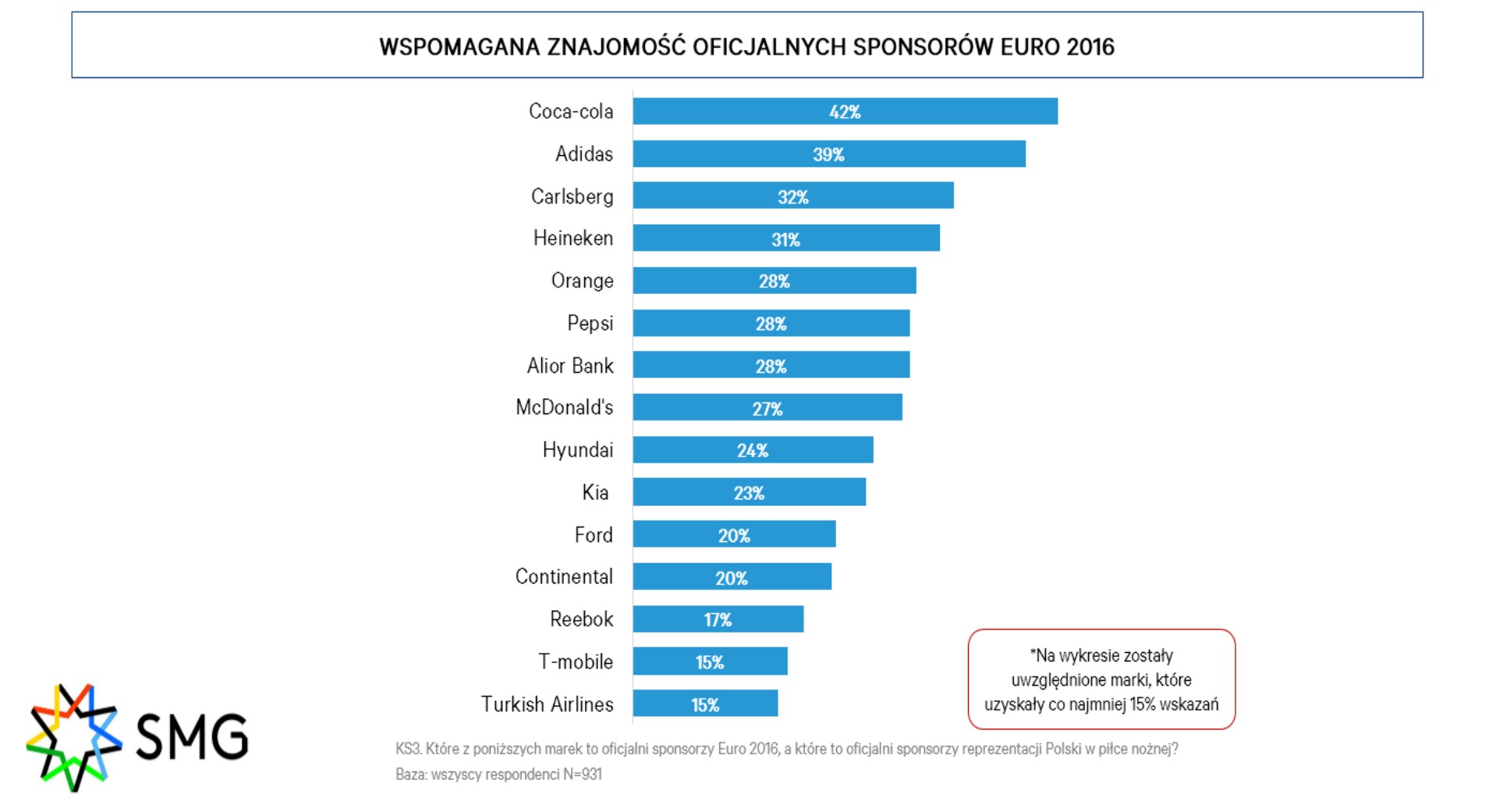 Najwyższą wspomaganą znajomość wśród oficjalnych sponsorów Euro 2016 miała marka Coca-Cola (42 proc. wskazań), tuż za nią uplasowała się marka Adidas (39 proc.), a następnie Carlsberg (32 proc.). Co ciekawe na czwartej pozycji znalazła się marka Heineken, która nie jest związana ani z Euro 2016, ani z reprezentacją. Najsłabiej wśród oficjalnych sponsorów Mistrzostw Europy (aktywnych reklamowo w blokach reklamowych przy transmisjach) Polacy kojarzą marki Continental (20 proc.) oraz Turkish Airlines (15 proc.). Co ciekawe wysoko w tym zestawieniu uplasował się Alior Bank (28 proc.), który sponsoruje reprezentację, a nie Euro 2016, tymczasem marka tego banku wypadła nieco lepiej niż McDonalds, Hyundai czy Kia.