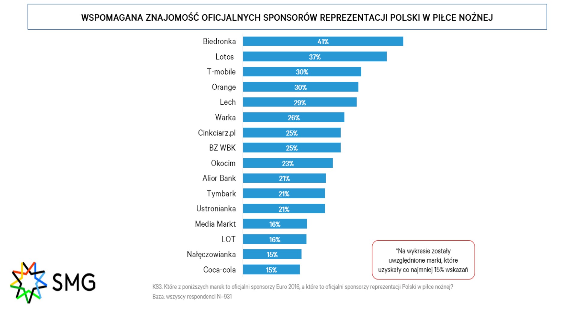 41 proc. respondentów w badaniu znajomości wspomaganej prawidłowo wskazało markę Biedronka jako sponsora głównego reprezentacji. Lotos wskazany został przez 37 proc. ankietowanych, ale kolejni oficjalni sponsorzy reprezentacji byli już słabiej rozpoznawani: Cinkciarz.pl (25 proc.), Okocim (23 proc.), Ustronianka (21 proc.), Alior Bank (21 proc.). Nieco lepiej od Alior Banku wypadł Bank Zachodni WBK (25 proc.), który nie jest związany ani z Euro 2016, ani z reprezentacją. Niezwiązane z reprezentacją marki piwa Lech i Warka również wyprzedzają markę Okocim, która jest oficjalnym sponsorem polskich piłkarzy. Bardzo wysoko w zestawieniu pojawiła się również marka T-Mobile, która współpracuje z Robertem Lewandowskim, ale nie z całą reprezentacją.
