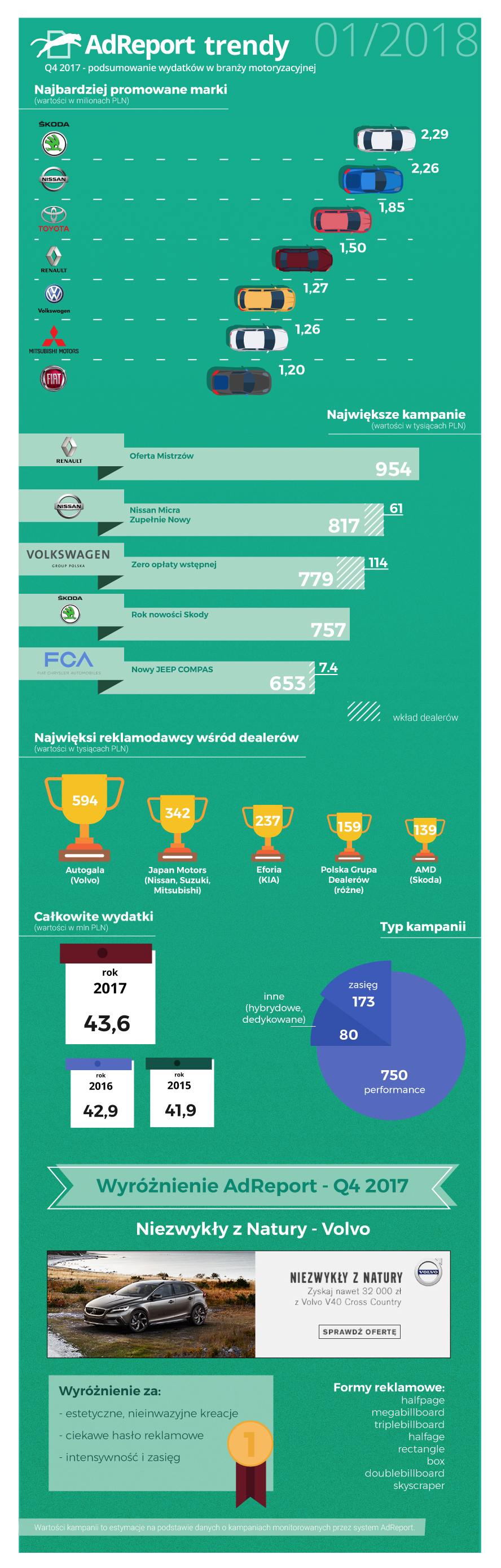 Zgodnie z danymi AdReporta w kategorii „Samochody osobowe” w ostatnim kwartale 2017 roku wyemitowano 1003 kampanie za łączną sumę 43,6 mln PLN. To o 700 tysięcy PLN więcej niż w poprzednim roku i 1,7 mln więcej niż w 2015. Wyniki pokazują, że reklamodawcy z segmentu moto stawiają na performance marketing – takich kampanii było według badania najwięcej bo aż 750, czyli prawie 75 proc. wszystkich. Pozostałe były emitowane w modelu zasięgowym oraz dedykowanym.
