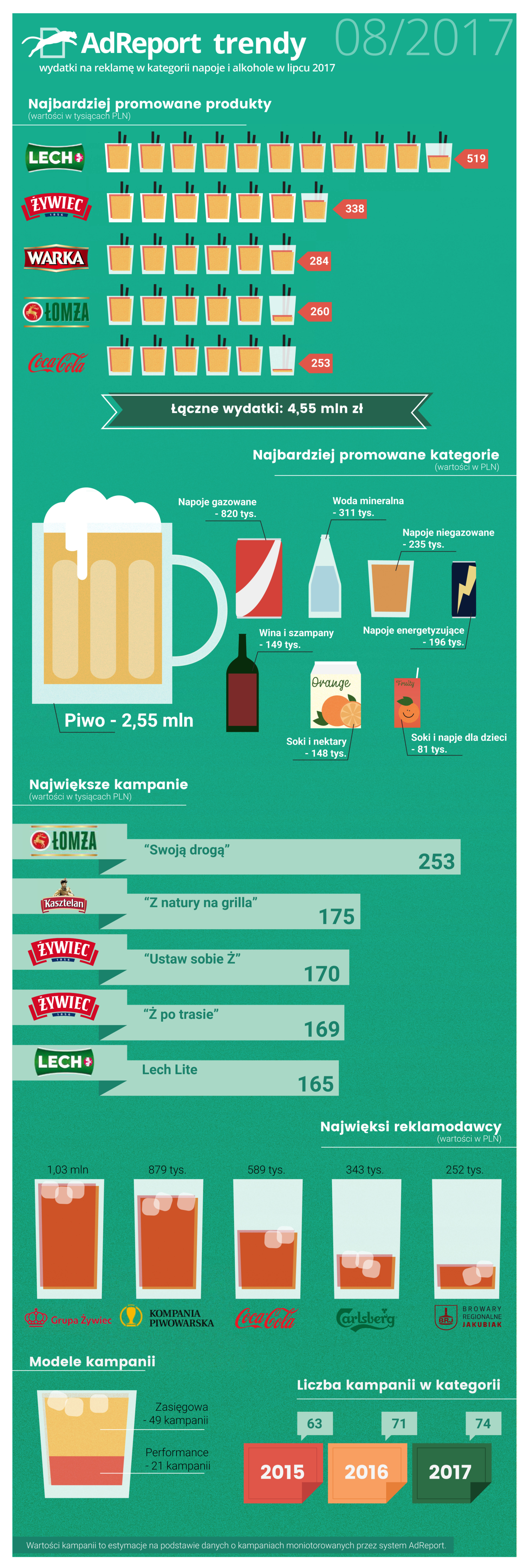 Zgodnie z danymi AdReporta w kategorii „Napoje i alkohole” w lipcu 2017 roku wyemitowano 74 ogólnopolskie kampanie o łącznej wartości ponad 4,6 mln PLN. Prawie jedna czwarta tej sumy pochodziła od największego reklamodawcy – Grupy Żywiec, która na promocję wszystkich swoich produktów wydała ponad 1,02 mln PLN. Największą część tej kwoty – 338 tysięcy PLN – przeznaczono na kampanie Piwa Żywiec. Nie dało to jednak Żywcowi tytułu najmocniej promowanego produktu w analizowanej kategorii. Aż o prawie 200 tysięcy więcej Kompania Piwowarska przeznaczyła na reklamę Lecha.