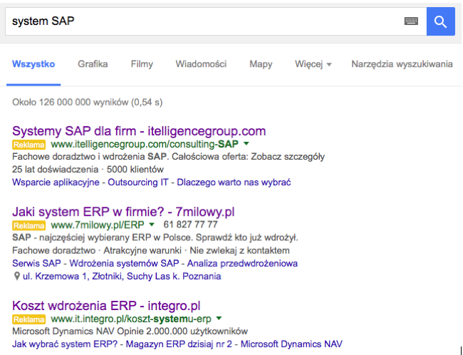 Żeby nie być gołosłownym poszukałem przykładów, choć z pewnością ten, kto reklamuje coś w B2B, widział bardziej jaskrawe. Wpisałem w Google frazę „system sap”.