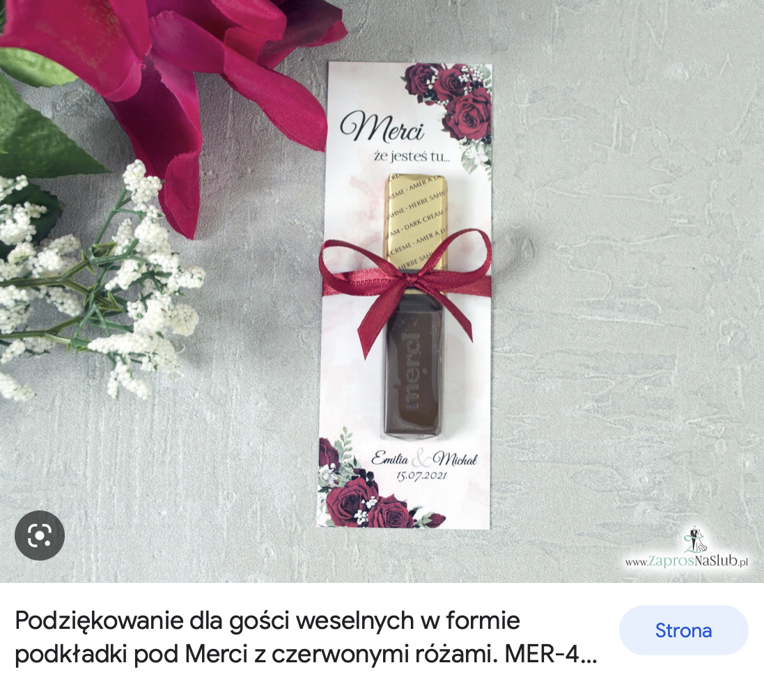 Sprawdziliśmy, czy „nagrody” w postaci pojedynczego Merci pojawiały się w firmach we wcześniejszych latach, czy jest to nowy korporacyjny trend. Okazało się, że karteczki z przyklejonymi pojedynczymi czekoladkami pojawiały się już wcześniej, ale w zupełnie innym kontekście – najczęściej jako upominki dla gości weselnych, którym dziękuje się za obecność w tym ważnym dla nowożeńców dniu.