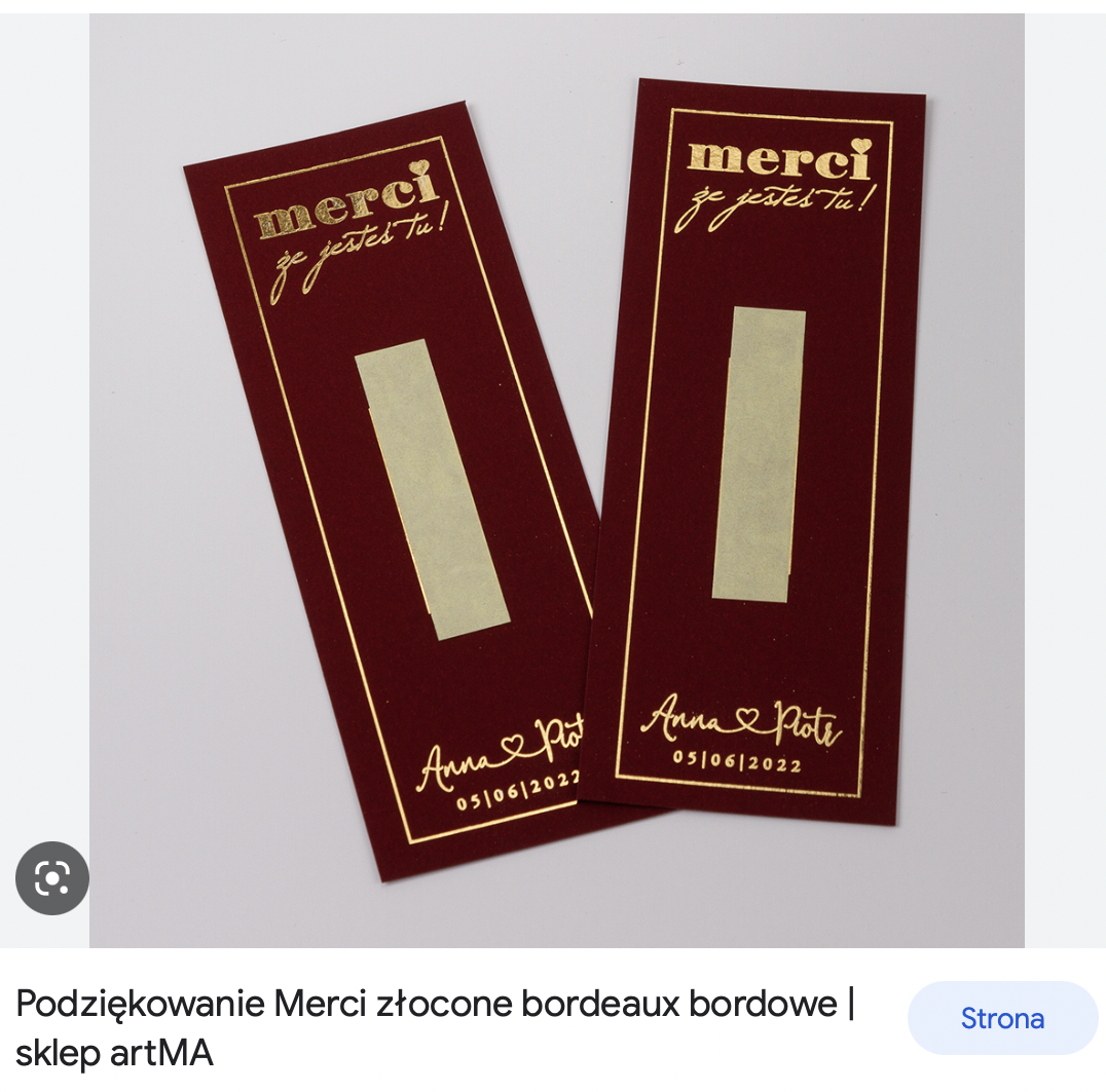 W internecie można kupić gotowe karteczki z miejscem do przyklejenia czekoladki i nadrukowanymi podziękowaniami. W internetowych sklepach, poza motywem weselnym, pojawiają się także kartki z podziękowaniami np. dla nauczycieli czy uczestników chrzcin.