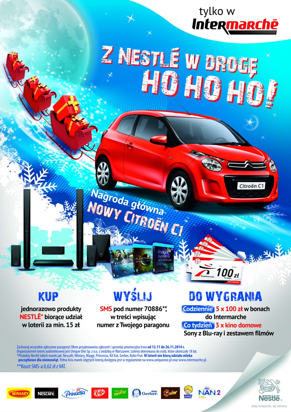 Aby wziąć udział w loterii prowadzonej w sieci Intermarche, należy kupić jednorazowo pro-dukty Nestlé biorące udział w loterii za min. 15 zł. Wysłać SMS pod wskazany numer 70886 w treści wpisując numer ze swojego paragonu. Loterią objęta jest większość marek Nestlé z wyłączeniem mlek początkowych. Codziennie do wygrania w loterii jest 5 bonów Intermar-che o wartości 100 zł każdy, a co tydzień losowane są 3 zestawy kina domowego Sony z Blu-ray z zestawem filmów. Na koniec ze wszystkich zgłoszeń wylosowany zostanie samochód Citroën C1.