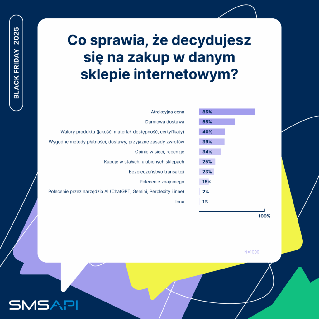 Jak pokazuje badanie SMSAPI, najważniejsze kryterium zakupu to dla polskich konsumentów atrakcyjna cena (85%), a dopiero potem darmowa dostawa (55%) i cechy produktu (51%).
