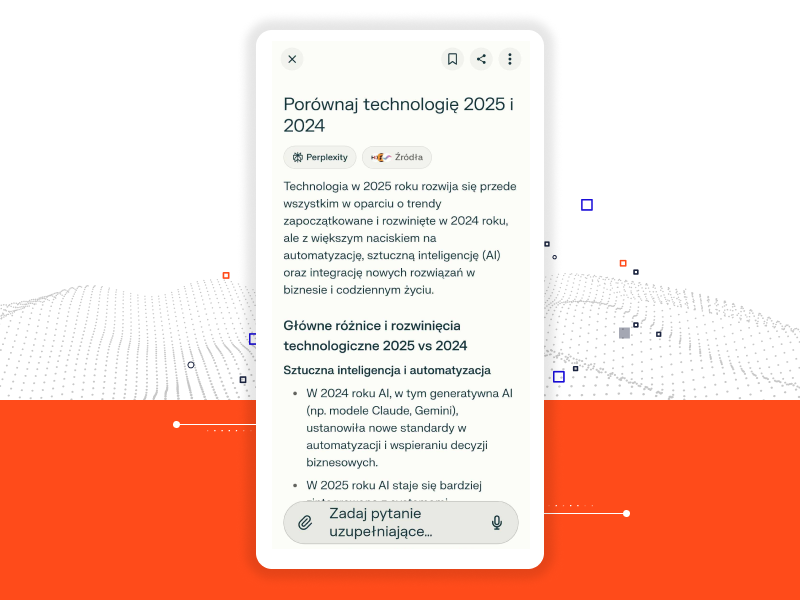 Według Gartnera z 2024 roku ponad 30% zapytań produktowych wśród osób z pokolenia Z i millenialsów zaczyna się poza klasycznymi wyszukiwarkami, w tym m.in. w chatbotach AI, takich jak ChatGPT, Perplexity czy Bing Copilot. Dodatkowo, Similarweb raportuje, że globalny ruch na stronie Google spadł o 2,6% w 2024 r. (r/r), podczas gdy narzędzia zintegrowane z AI notują wzrosty przekraczające 80%.