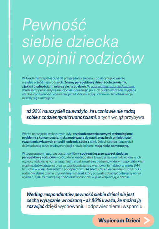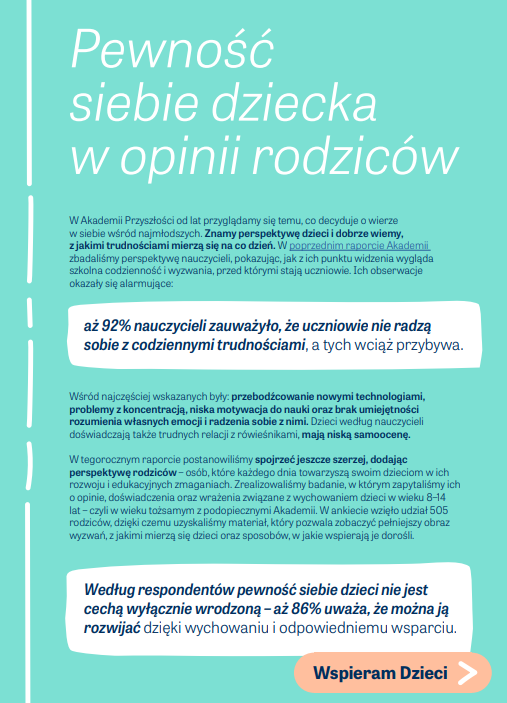 Autorzy raportu podkreślają jednak, że pewność siebie nie jest cechą wrodzoną. 86% badanych rodziców wierzy, że można ją rozwijać poprzez wychowanie i świadome wsparcie dorosłych. Akademia Przyszłości apeluje o większą uważność oraz tworzenie środowisk, w których dzieci czują się bezpieczne, wartościowe i sprawcze.