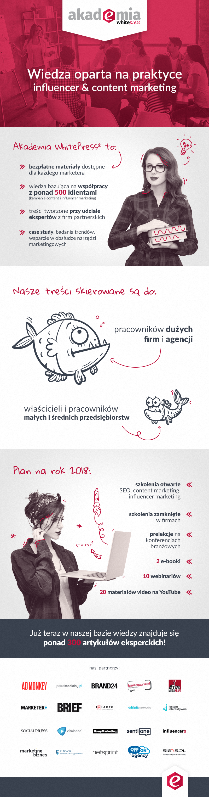 Polskie marki coraz chętniej inwestują w content marketing i influencer marketing. Część kampanii jest jednak prowadzona bez odpowiedniej strategii. Ideą, która przyświeca twórcom Akademii WhitePress jest zapewnienie wsparcia firmom chcącym osiągać jak najlepsze efekty i stosować dobre praktyki współpracy z influencerami. Projekt ma także zainspirować podmioty z mniejszym budżetem do rozszerzenia swoich dotychczasowych działań z obszaru marketingu.