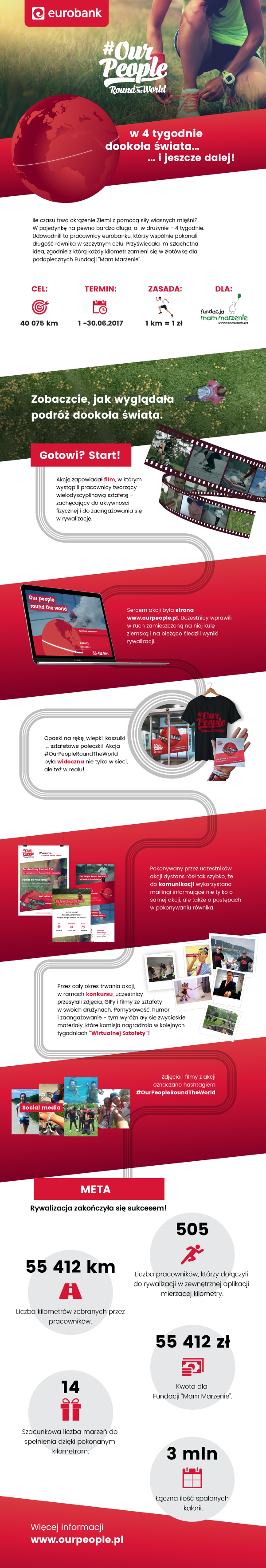 Celem akcji „Our People Round The World” było pokonanie przez pracowników eurobanku w 4 tygodnie odległości 40 075 km – czyli długości równika – uprawiając dowolną dyscyplinę sportową związaną z pokonywaniem dystansu. Za każdy przejechany kilometr bank miał przekazać 1 złoty na realizację marzeń chorych dzieci z Fundacji „Mam marzenie”. Liczbę pokonanych wspólnie kilometrów uczestnicy akcji mogli śledzić w czasie rzeczywistym dzięki interaktywnej kuli ziemskiej na www.ourpeople.pl, a licznik ukazujący trasę pozostałą do przebycia mobilizował do dodatkowych aktywności. Jak się okazało w finale akcji, bardzo skutecznie: 505 pracowników, którzy dołączyli do rywalizacji, pokonało łącznie 55 412 km – średnio jeden uczestnik pokonał 110 km. W efekcie eurobank przekazał Fundacji „Mam marzenie” kwotę 55 412 zł na realizację marzeń chorych dzieci.