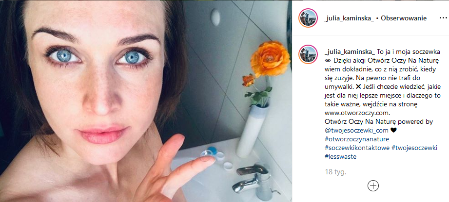 Choć w branży marketingowej pojawiają się głosy, że era influencerów powoli będzie dobiegać końca, akcje promocyjne, ale też społeczne pokazują, że znana twarz w połączeniu z mediami społecznościowymi nadal świetnie się sprawdza. – Długo zastanawialiśmy kto powinien wesprzeć naszą akcję. Postawiliśmy na współpracę z aktorką Julią Kamińską i był to strzał w dziesiątkę. Zależało nam na tym, żeby była to osoba autentycznie zaangażowana w ekologię i sama używająca od dawna soczewek kontaktowych. Nasze analizy pokazują jasno – wszelkie wzmianki nt. akcji, w których pojawiała się Julia Kamińska budziły największe zainteresowanie – mówi Jacek Szkólski.