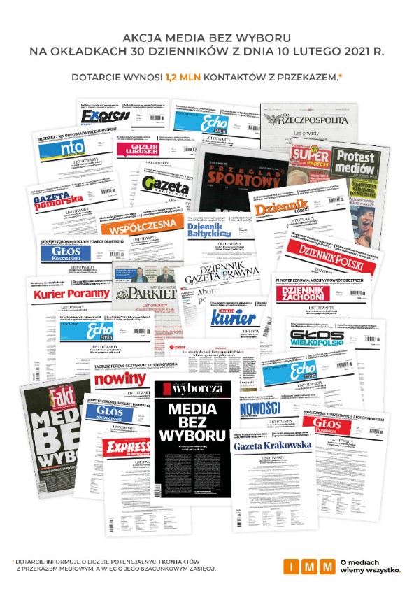 30 dzienników opublikowało wczoraj na pierwszych stronach swoich gazet hasło przewodnie sprzeciwu lub list otwarty do władz Rzeczypospolitej Polskiej i liderów ugrupowań politycznych. Samo działanie tytułów prasowych to dotarcie na poziomie 1,2 mln kontaktów z przekazem – podaje Instytut Monitorowania Mediów IMM.