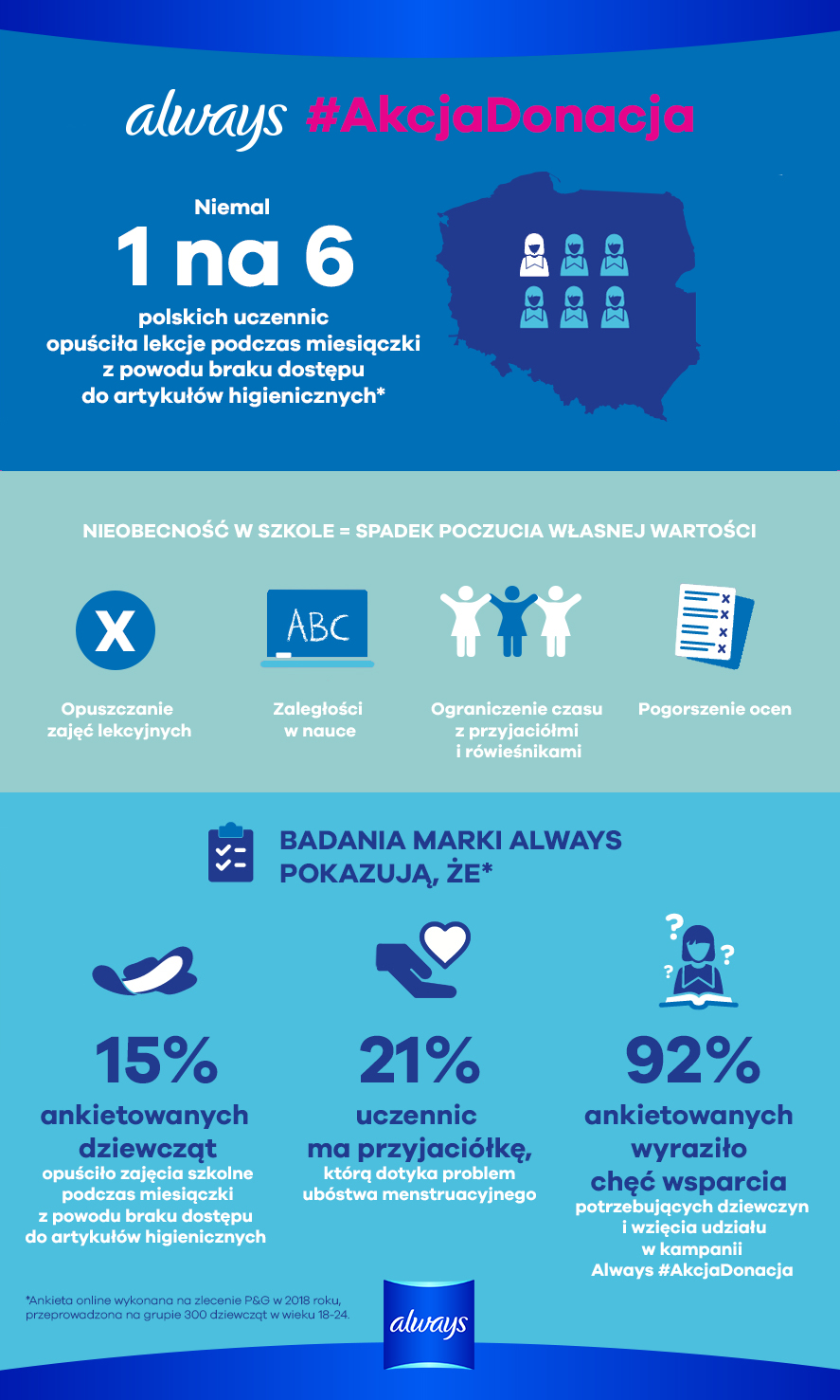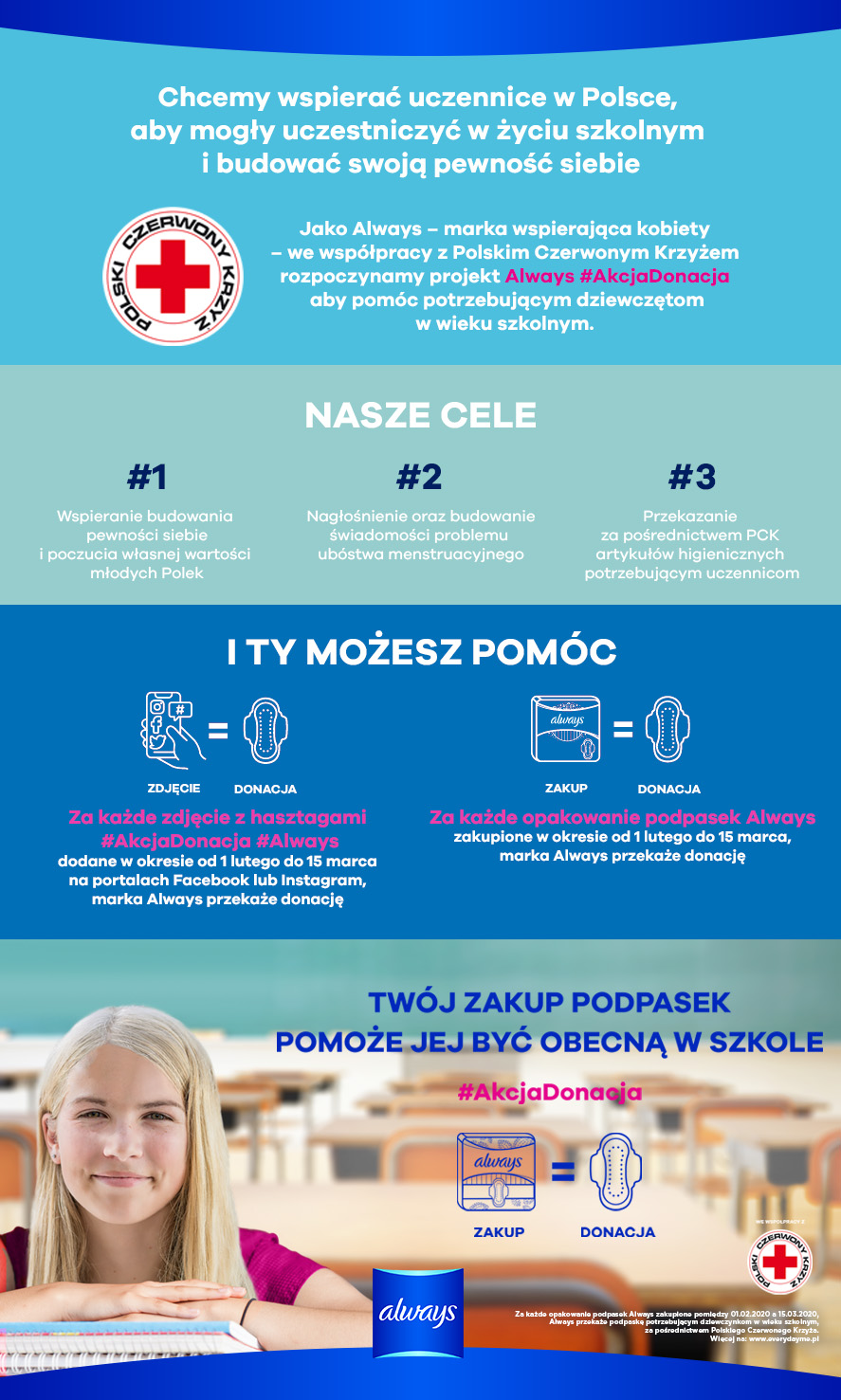 Marka Always od lat wspiera młode dziewczyny na całym świecie w budowaniu poczucia własnej wartości. Po sukcesie wieloletniej kampanii Always #JakDziewczyna, przyszła pora na nowy projekt. We współpracy z Polskim Czerwonym Krzyżem, producent kobiecych produktów higienicznych P&G rozpoczyna program Always #AkcjaDonacja mający na celu wspieranie uczennic, które ze względów finansowych nie mogą sobie pozwolić na zakup artykułów menstruacyjnych.