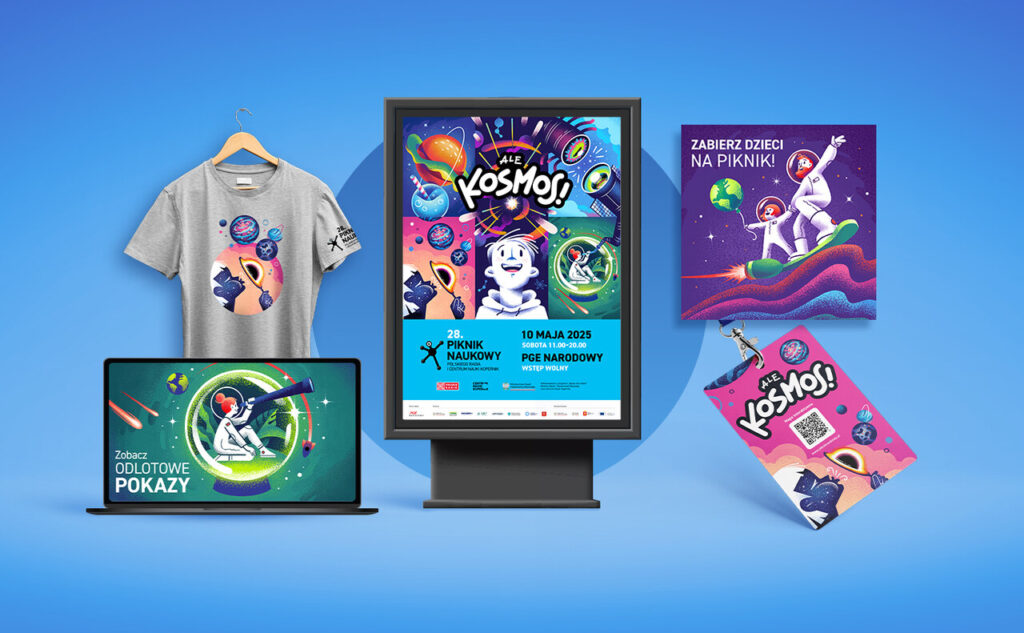 Pierwszym z nich jest identyfikacja wizualna połączona z kampanią promującą 28. Piknik Naukowy Centrum Nauki Kopernik. Ilustracja była tu osią całej komunikacji – tworząc świat przystępny i interesując zarówno dla dzieci, jak i dorosłych. W tej realizacji udało się opowiedzieć o nauce w nowoczesny i angażujący sposób, a spójny system ilustracji pozwolił wyróżnić wydarzenie zarówno w przestrzeni miejskiej, jak i komunikacji online.