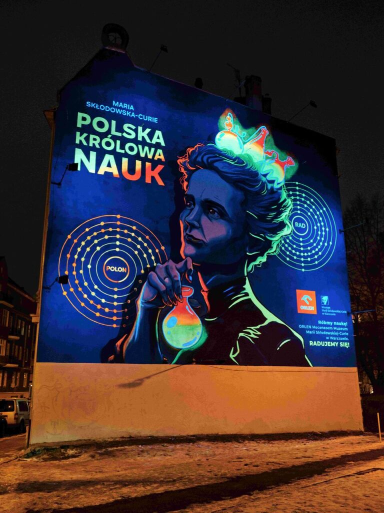 Największym wyzwaniem było opowiedzenie o Marii Skłodowskiej-Curie w nowy, świeży sposób, przyciągający uwagę, zaskakujący i atrakcyjny dla każdej grupy wiekowej. Fluorescencyjność to bezpośrednie nawiązanie do odkryć naszej noblistki, a także do „rozświetlonej” ekspozycji w Muzeum Marii Skłodowskiej-Curie w Warszawie. Tak powstała nowoczesna wersja „królewskiego” portretu, z fluorescencyjną koroną utworzoną z fiolek, kolb i próbówek. Fakt, że mural zmienia się i ożywa w nocy za pomocą światła, bardzo pozytywnie wpłynął na odbiór, budząc ogromne zainteresowanie mediów i przechodniów.