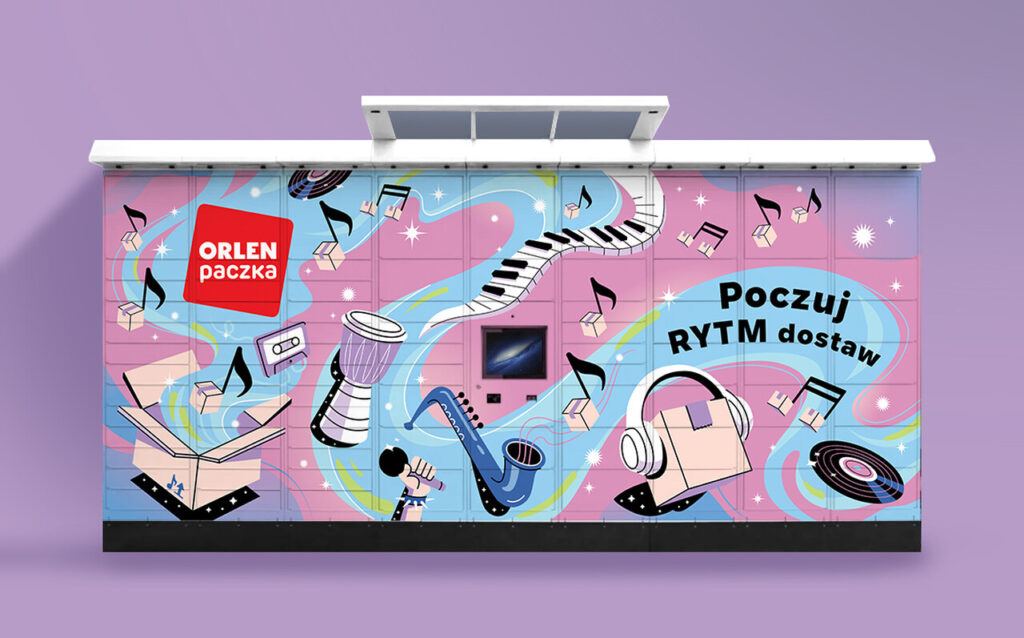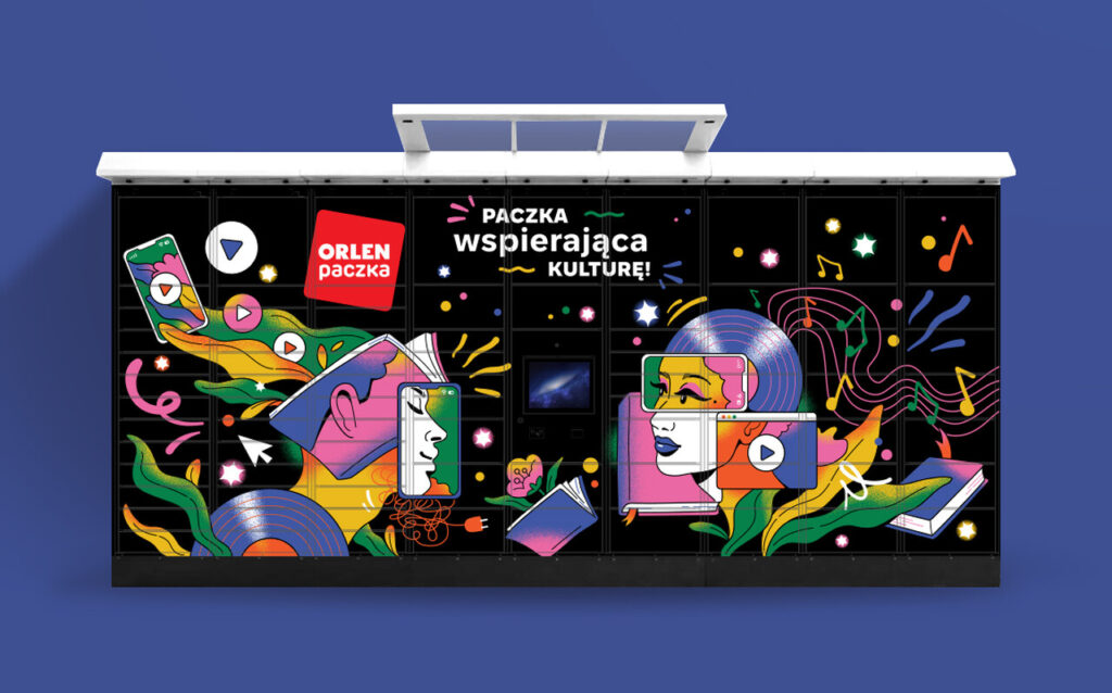 Drugim projektem były ilustracje przygotowane na automaty ORLEN Paczka. Jeden z nich powstał na festiwal Inside Seaside i stał się naturalną częścią muzycznego wydarzenia. Drugi połączył świat kultury z wyrazistą stylistyką na gali Bestsellery Empiku. Oba automaty paczkowe wzmacniały tożsamość marki i pomagały stworzyć unikalne doświadczenia podczas wyjątkowych eventów.