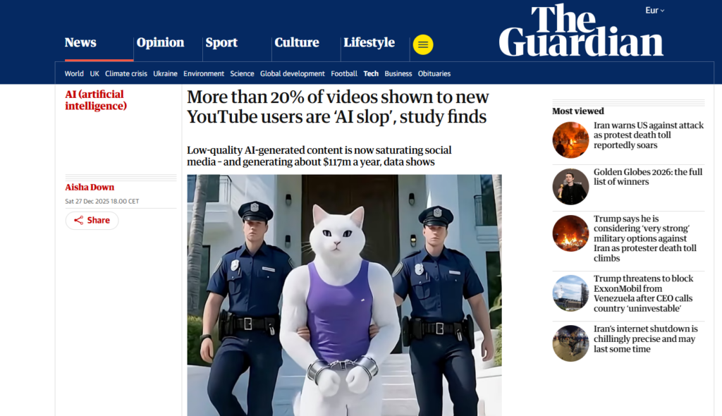 Z badania opublikowanego przez organizację Center for Countering Digital Hate (CCDH) wynika, że ponad 20% filmów wyświetlanych nowym użytkownikom YouTube’a to tzw. AI slop – treści masowo generowane przez sztuczną inteligencję, niskiej jakości, często pozbawione wartości informacyjnej lub rozrywkowej.