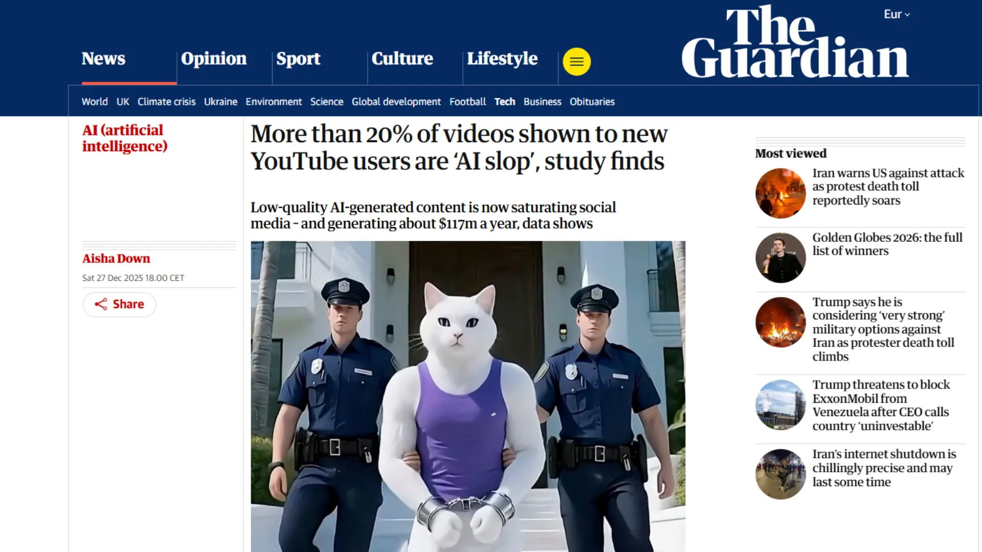 Z badania opublikowanego przez organizację Center for Countering Digital Hate (CCDH) wynika, że ponad 20% filmów wyświetlanych nowym użytkownikom YouTube’a to tzw. AI slop – treści masowo generowane przez sztuczną inteligencję, niskiej jakości, często pozbawione wartości informacyjnej lub rozrywkowej.
