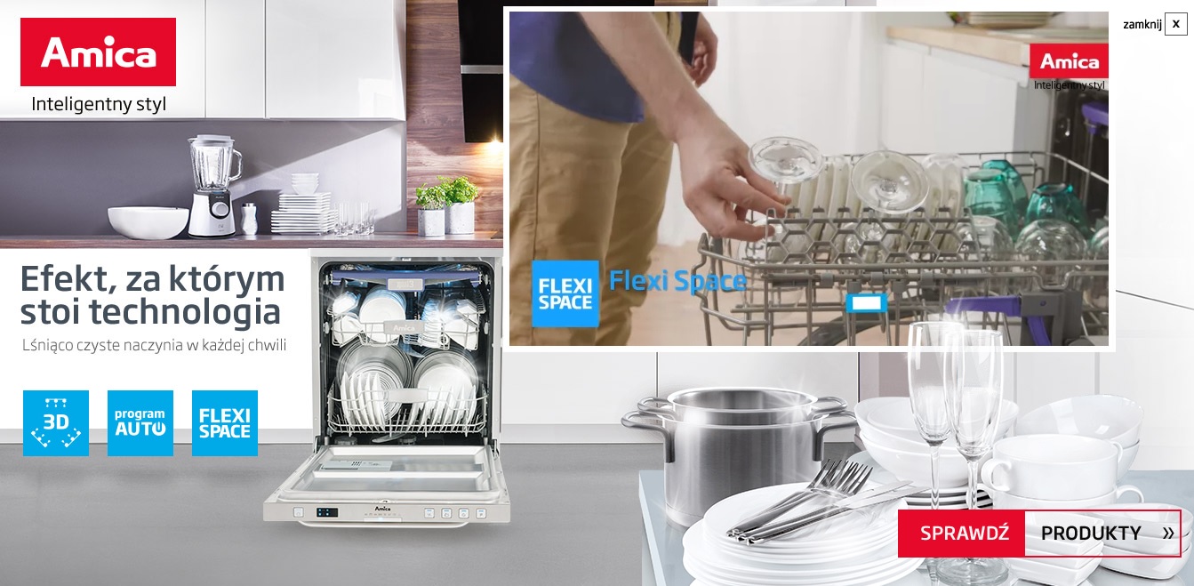 Przechodząc na wersję expandowaną, użytkownikowi wyświetla się cały spot. Po jego obejrzeniu, za pomocą wtyczek społecznościowych, może on przekazać informacje dalej. Sama kreacja dodatkowo opisuje trzy główne zalety urządzenia – zmywanie 3D, program Auto oraz Flexi Space. Dzięki temu można poznać innowacje jeszcze przed przejściem na stronę docelową. Projekt reklamy powstał na podstawie materiałów graficznych i spotu, dostarczonych przez Amikę.