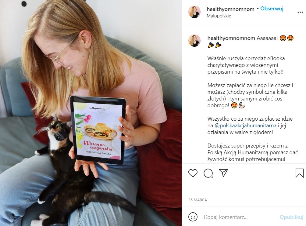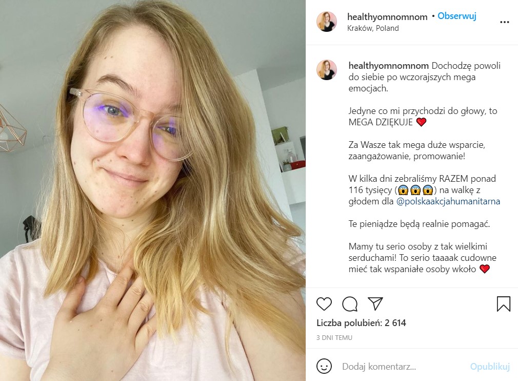 Świetnym przykładem jest blogerka Mamaginekolog, która już od kilku lat angażuje się w zbiórkę pieniędzy na rzecz Wielkiej Orkiestry Świątecznej Pomocy. W tym roku udało się jej zebrać rekordową kwotę – ponad 5 mln złotych. Natomiast niedawno na platformie Pomagamy.pl wystartowała zbiórka Ireny Owsiak, blogerki prowadzącej profil Healthy Omnomnom, która została stworzona, by wesprzeć osoby niedożywione i w kryzysie głodu.