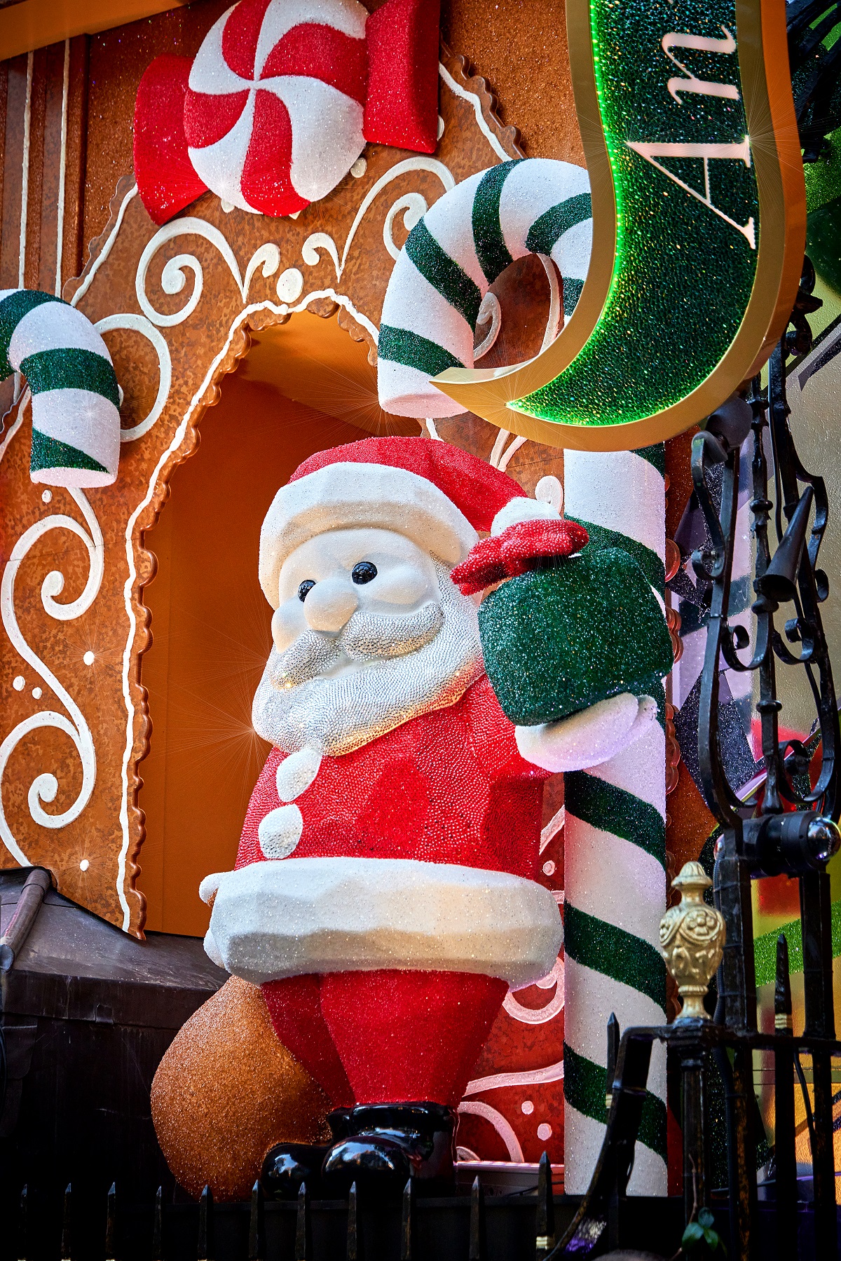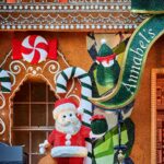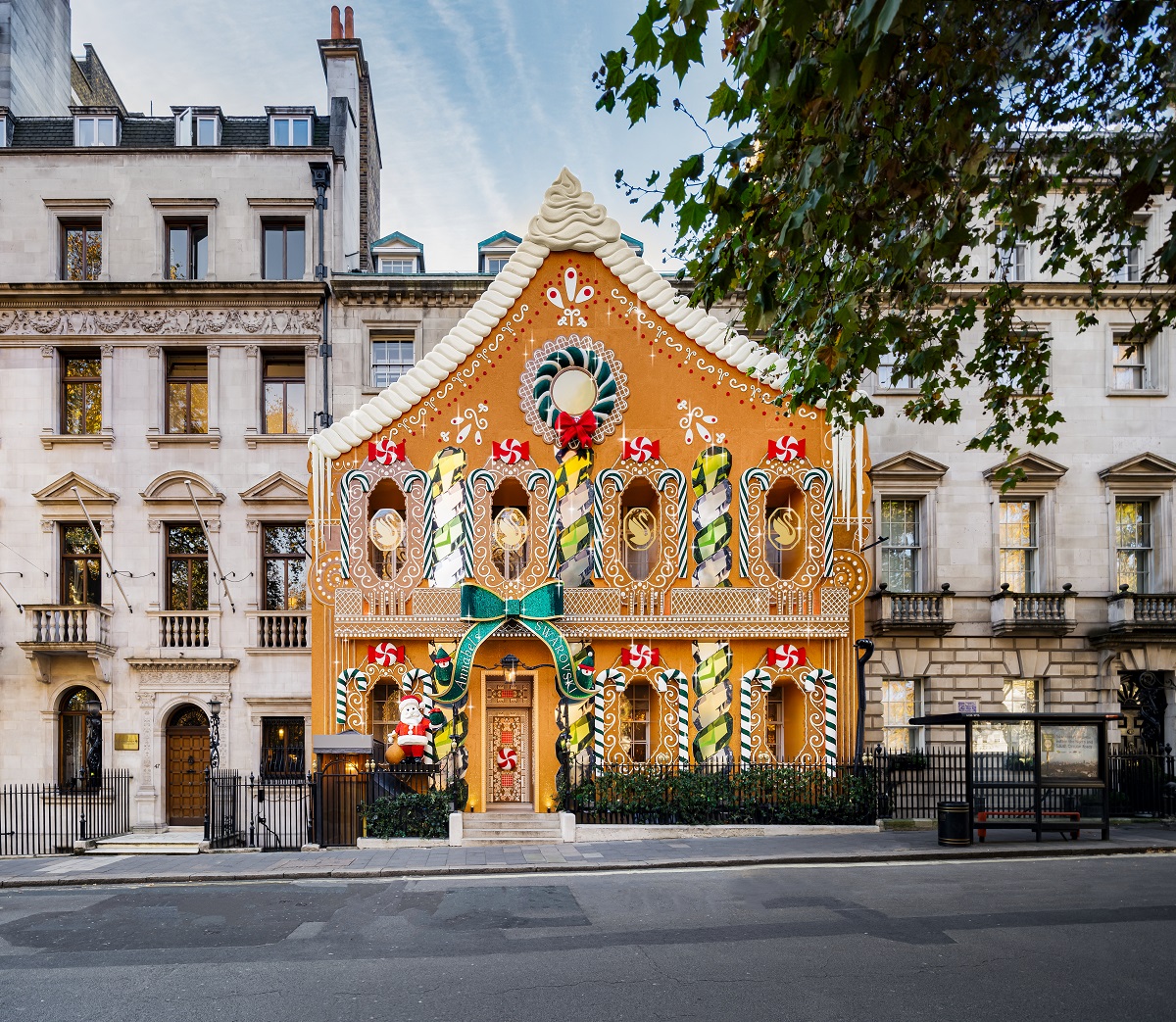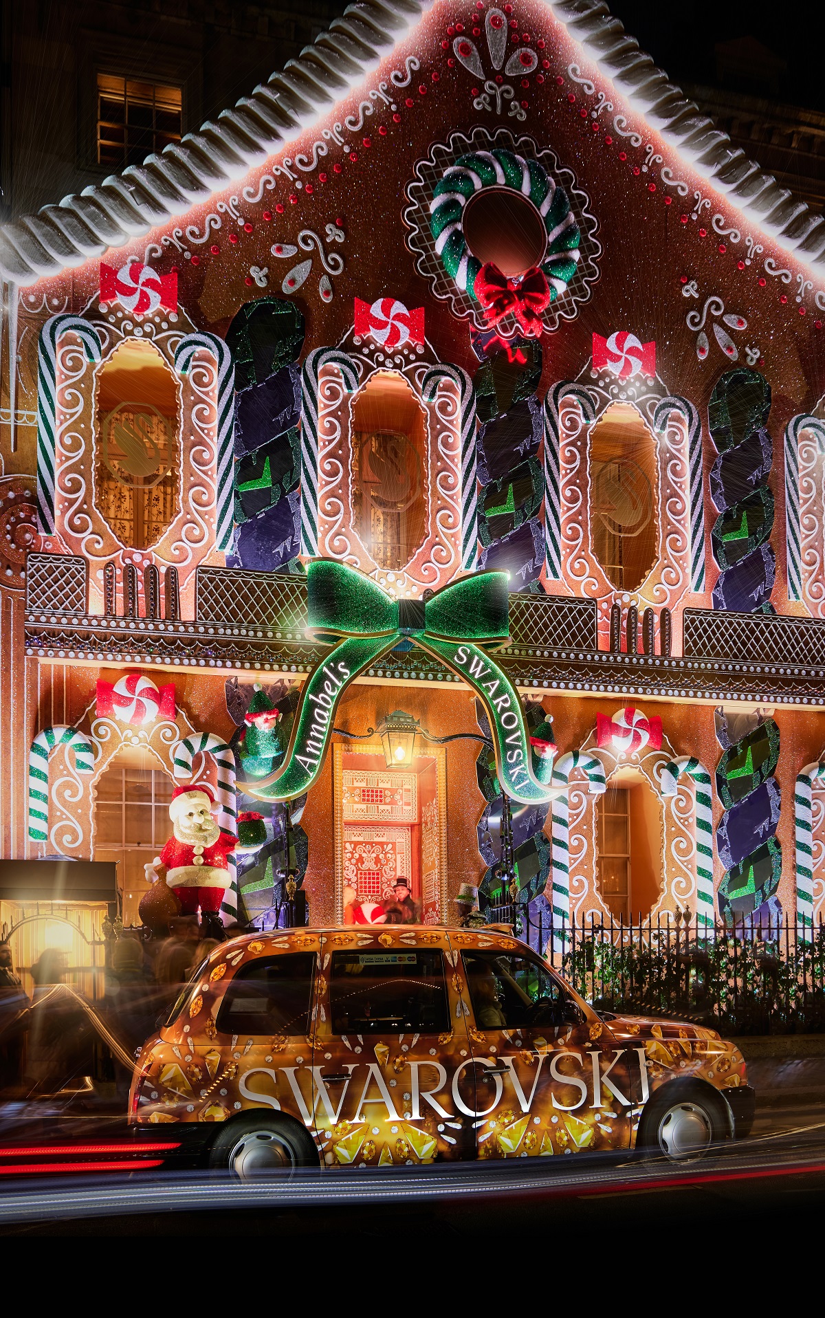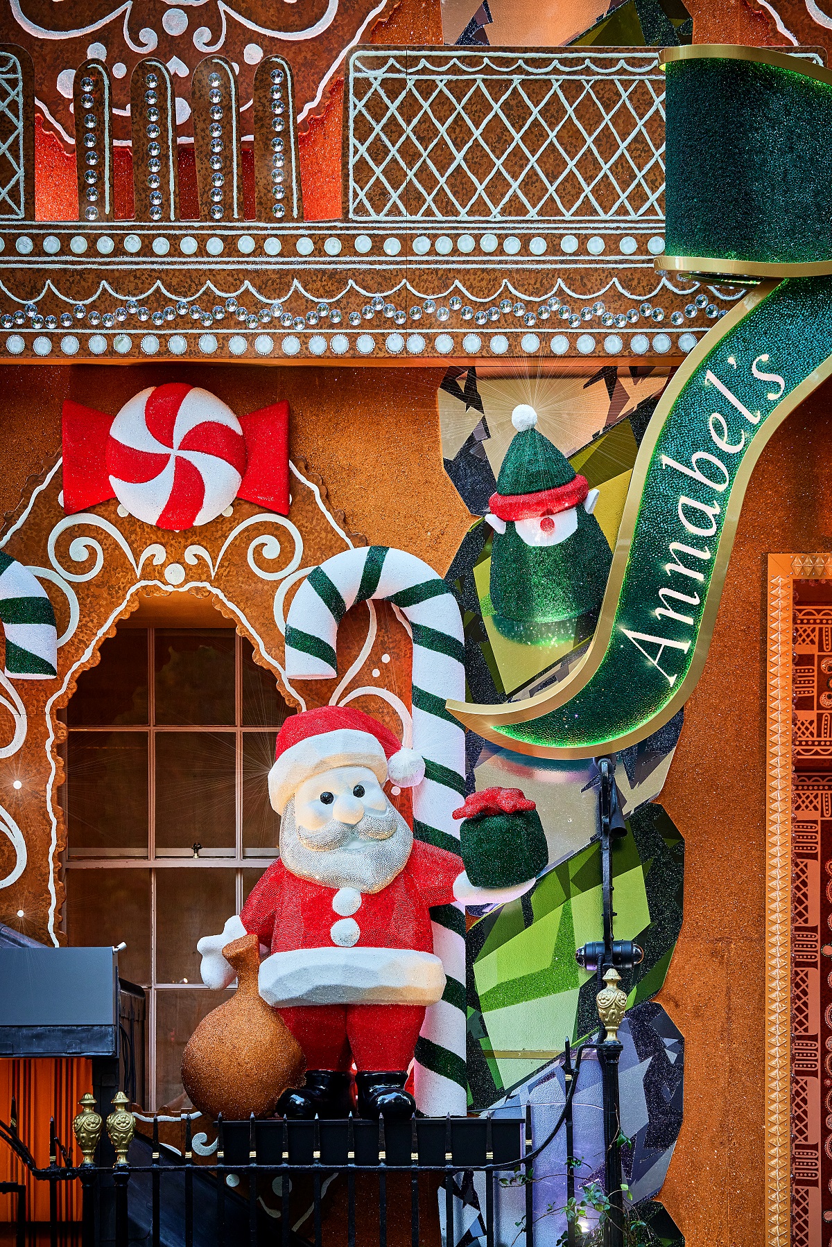 Fasada w kolorze toffi, z lukrem wykonanym z ręcznie rzeźbionego i oprószonego kryształami włókna szklanego, aby szczegółowo określić kontury dachu (tak jak lukier cukrowy zdobiłby jadalny domek z piernika). Łabędzie Swarovskiego, obramowane laskami cukrowymi i zwieńczone ponadwymiarowymi cukierkami humbug, typowymi dla Wielkiej Brytanii, świecą z każdego okna budynku. Kolumny, które obramowują wejście do Annabel’s, są oplecione szmaragdowymi i przezroczystymi kryształami, a olbrzymia figurka Świętego Mikołaja marki Swarovski wita gości u stóp drzwi.