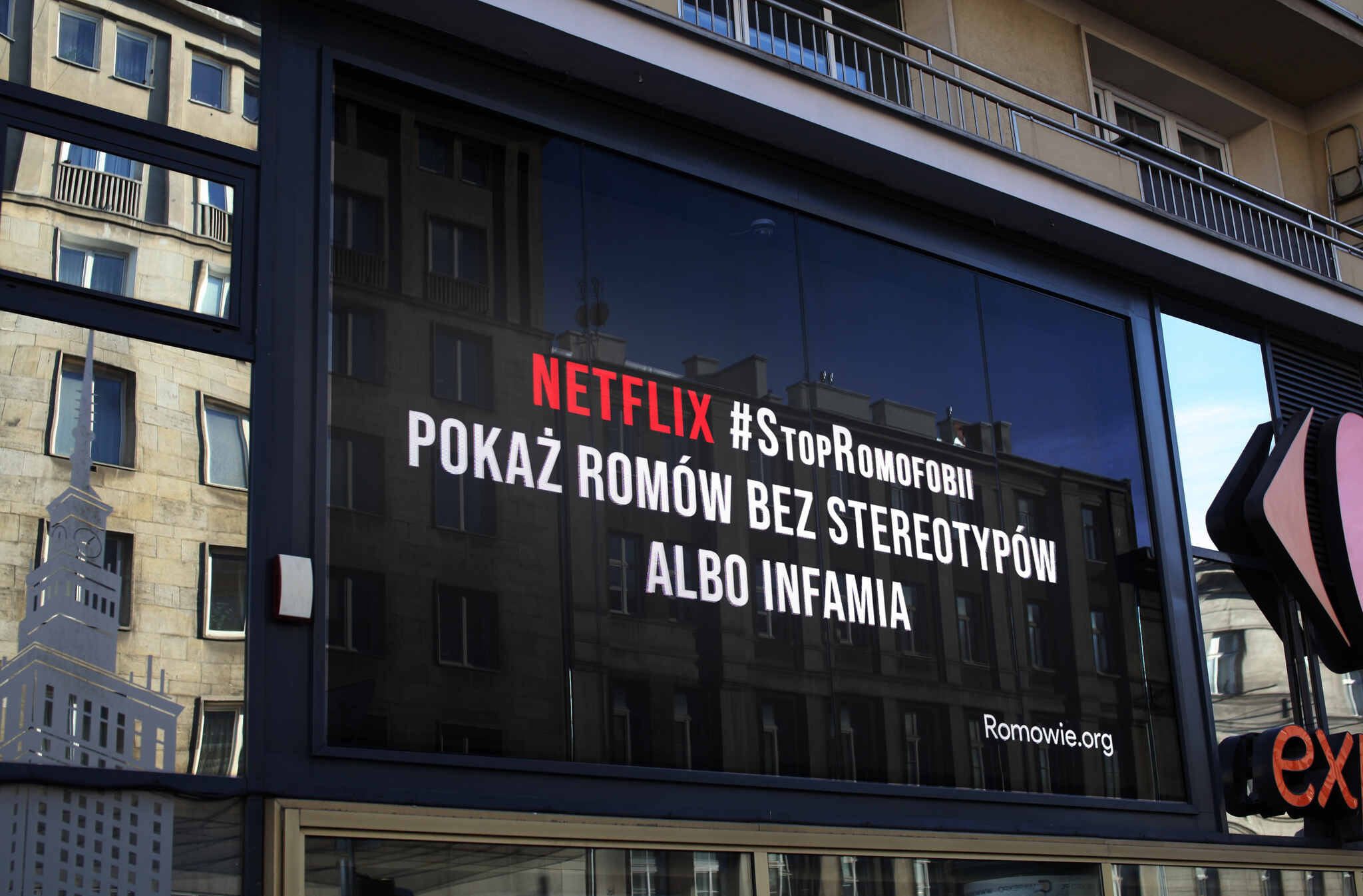 W sąsiedztwie muralu Netflixa, znajdującym się na skrzyżowaniu ulic Kruczej i Alei Jerozolimskich, wyświetlono wiadomość nawiązującą do popularnego serialu „Infamia”, który powiela wiele stereotypów na temat Romów. Billboard wzywa Netflix do pokazania tej grupy etnicznej bez krzywdzących ją uprzedzeń.