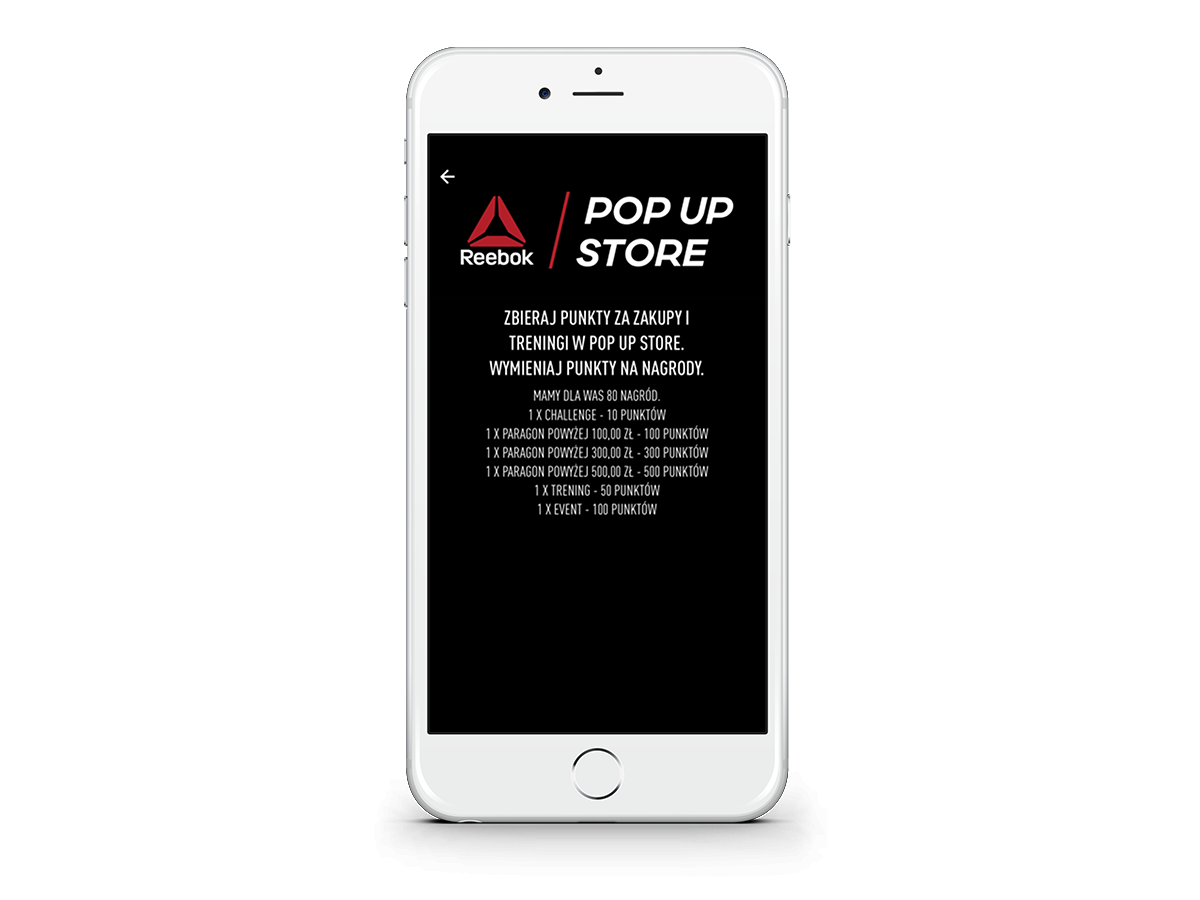 Przy każdym zakupie w strefie Pop Up Store 2016 lub podczas każdej z aktywności wyświetlane są qr kody. Po ich zeskanowaniu aplikacja zlicza punkty. Aktywności zostały podzielone na kilka kategorii: ZAKUPY (w zależności od wysokości paragonu: 100, 300, 500 pkt.), CHALLENGE (10 pkt), EVENT (100 pkt.), TREINING (50 pkt). W czterech edycjach do wygrania jest w sumie 80 atrakcyjnych nagród, m.in. gry UFC 2 na PS4 lub Xboxa, pakiety na Spartan Race czy też prywatne treningi z Karoliną Erdman i Łukaszem Malinowskim.