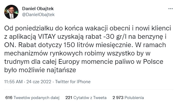 Kilka dni temu Daniel Obajtek, prezes PKN Orlen, udostępnił na Twitterze informację o „wakacyjnej promocji” na stacjach koncernu. Użytkownicy aplikacji Orlen Vitay mogą zapłacić 30 groszy mniej za litr paliwa po aktywacji mobilnych kuponów. Promocja zakłada, że kierowca będzie mógł zatankować do 50 litrów tańszego paliwa w ciągu 30 dni. W efekcie zaoszczędzi maksymalnie 45 zł miesięcznie.
