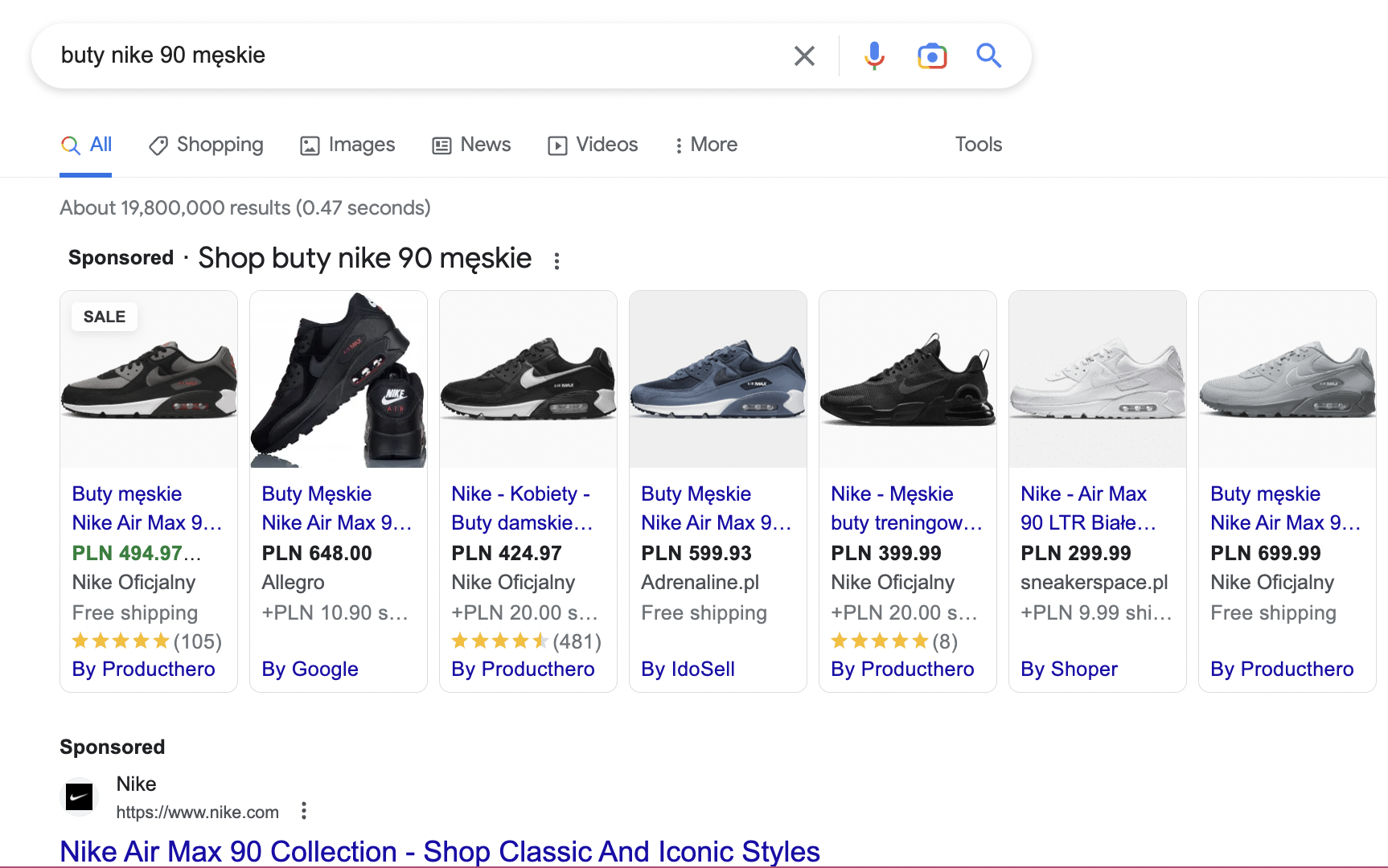 Użytkownik wpisujący konkretne zapytanie w Google, np. „czerwone Nike Air Max Pegasus rozmiar 42” powinien otrzymać reklamy kilku różnych sprzedawców. W reklamach tych zawarte będą zdjęcia produktów, ich cena, nazwa i ewentualnie dodatkowa informacja o kosztach wysyłki lub promocji.