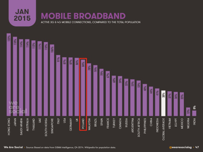 Jeszcze trochę ciekawych liczb – smartfony stanowią obecnie 38 proc. wszystkich aktywnych komórek na świecie. Mniej więcej od roku 2005 słyszy się, że nadchodzi rok mobile. Prawda jest jednak taka, że żyjemy w dekadzie mobile – a okres ten będzie się stale wydłużać, ponieważ próżno szukać tendencji zniżkowych. Tym bardziej, że już niemal 40 proc. połączeń z internetem mobilnym odbywa się przez sieć 3G lub 4G, co rusz maleje zatem liczba ograniczeń, które wiążą ręce osobom związanym z biznesem mobilnym (dane wciąż z We Are Social).
