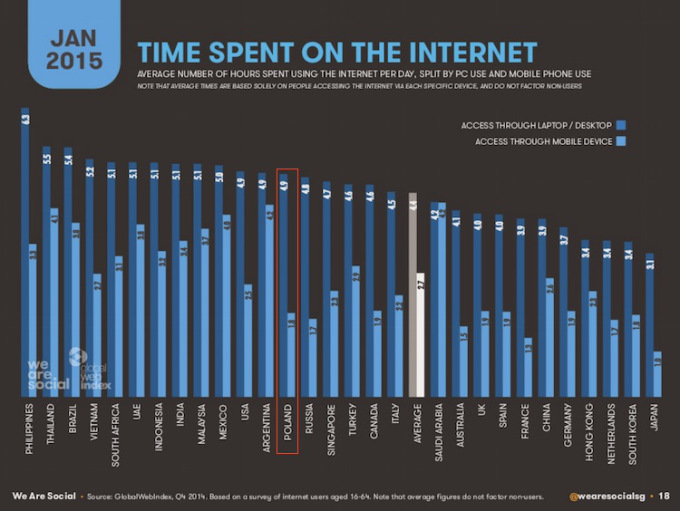 Rynek mobilny regularnie rośnie, dzięki coraz większej przystępności. Pakiet danych u operatorów krajowych to od dawna standard, dlatego już ponad połowa ludności na świecie ma dostęp do internetu za pośrednictwem smartfonu (dane zebrane przez serwis We Are Social). W Polsce jednak wciąż korzystamy z mobilnego internetu rzadziej niż na świecie – z tego samego badania wynika, że przeciętny Polak na mobilne surfowanie poświęca około 1,8 godziny dziennie (na świecie to 2,7 godziny). Lubimy jednak urządzenia desktopowe – na nich średnia to już 4,9 godzin (na świecie – 4,4). Polska jest również mocno mobilna jeśli chodzi o uśrednione dane dotyczące przeglądania stron na urządzeniach przenośnych – w naszym kraju aż 46 proc. wszystkich odsłon pochodzi z mobili. Średnia światowa to 33 proc. – wygląda zatem na to, że od mobilnego internetu nie chcemy uciekać, a wręcz przeciwnie.