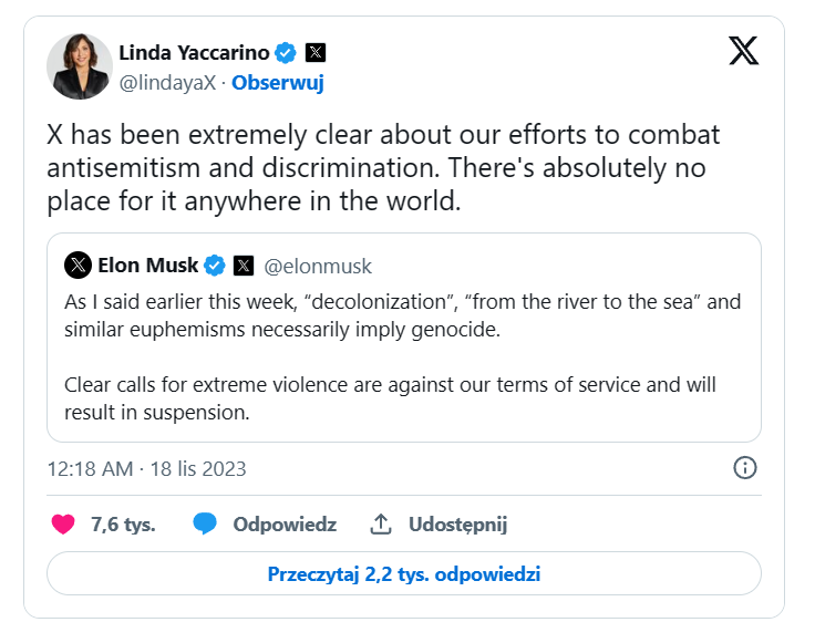 – X niezwykle jasno wyraził się o naszych wysiłkach na rzecz zwalczania antysemityzmu i dyskryminacji. Absolutnie nie ma na to miejsca nigdzie na świecie – napisała Linda Yaccarino, Dyrektor Generalna X.