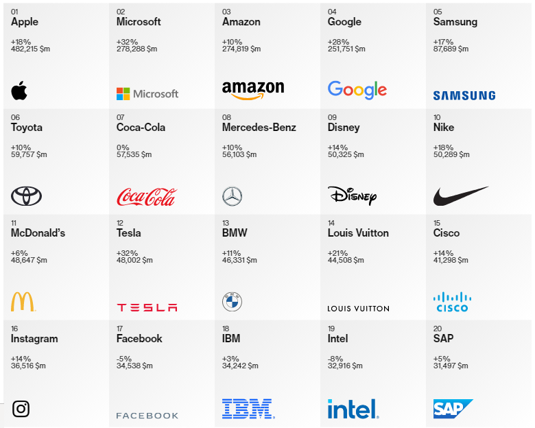 Całkowita wartość 100 najcenniejszych marek w 2022 roku wynosi 3 088 930 bln dolarów, co oznacza wzrost o 16% w stosunku do 2021 roku (2 667 524 bln dolarów). Ponadto w tym roku tempo wzrostu wartości najsilniejszych marek na świecie było najszybsze.