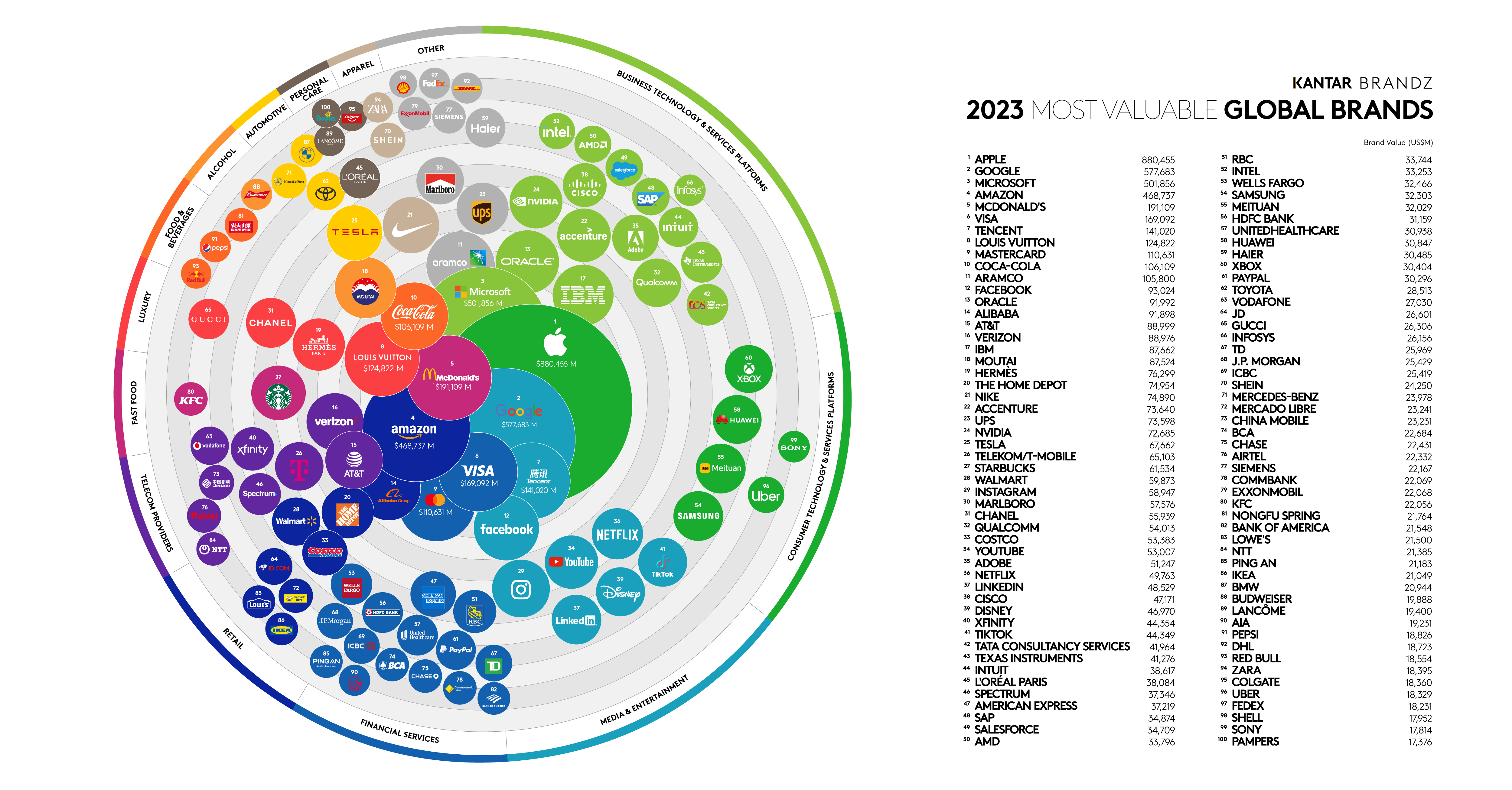 Marka Apple, z wyceną na poziomie 880 mld USD, okazała się odporna na niełatwe warunki rynkowe, a uzasadnieniem jej poziomu cenowego (premium) jest pozytywne postrzeganie marki. W ten sposób udowadnia ona, że znaczące, odmienne i istotne marki są najlepiej przygotowane do przetrwania globalnych zakłóceń gospodarczych. Google i Microsoft uzupełniają pierwszą trójkę, a marki technologiczne po raz kolejny są najliczniej reprezentowane w Top 100 i mogą pochwalić się największym udziałem w rankingu marek pod względem wartości.