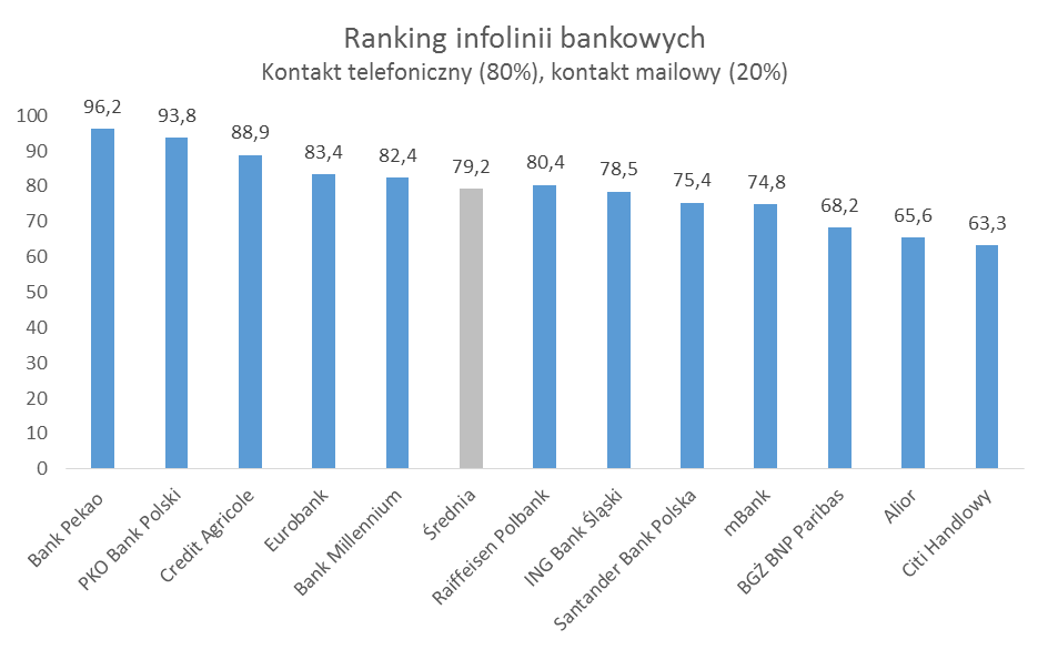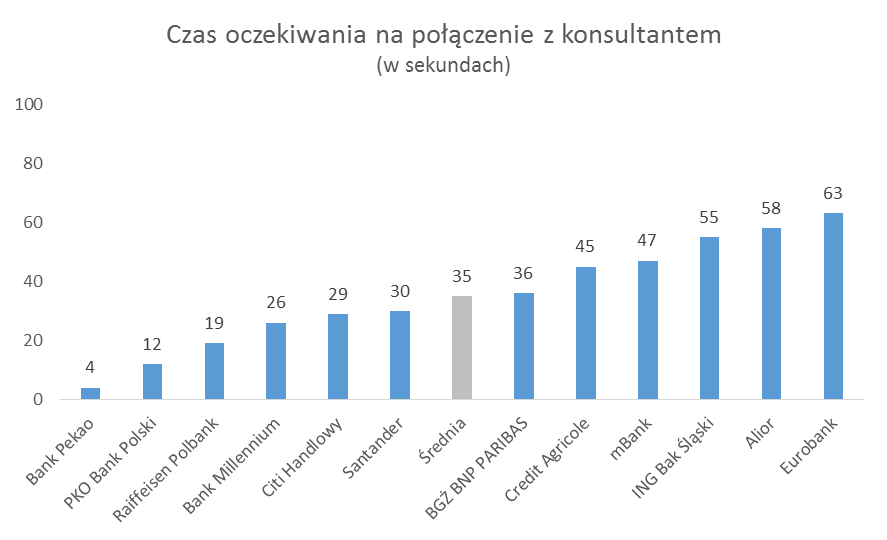 Liderem pod względem czasu oczekiwania na połączenie z konsultantem został, podobnie jak w ubiegłym roku, Bank Pekao. W sześciu bankach czeka się na połączenie dłużej niż jeszcze rok temu, w czterech krócej, a w dwóch czas oczekiwania się nie zmienił. Średnio klienci na infoliniach czekają o 4 sekundy dłużej niż jeszcze rok temu. Bankiem, który w największym stopniu poprawił swój ubiegłoroczny wynik jest Raiffeisen Polbank – skrócenie czasu oczekiwania na połączenie z konsultantem z 49 sekund do 19.