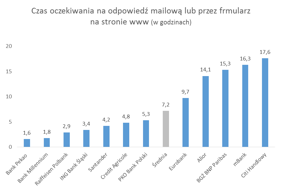 Najkrócej na odpowiedź mailową lub przez formularz na stronie www czeka się w Banku Pekao. Istotnie obniżył się średni czas oczekiwania na odpowiedź – ponad dwukrotnie (z 15,7 h do 7,2 h). Wynika to z istotnego obniżenia czasu oczekiwania w dwóch bankach, w których w zeszłym roku czas oczekiwania był kilkukrotnie wyższy od średniej. W rzeczywistości w siedmiu z dwunastu badanych banków czas oczekiwania na odpowiedź mailową lub przez formularz na stronie www się wydłużył, a w pięciu skrócił.