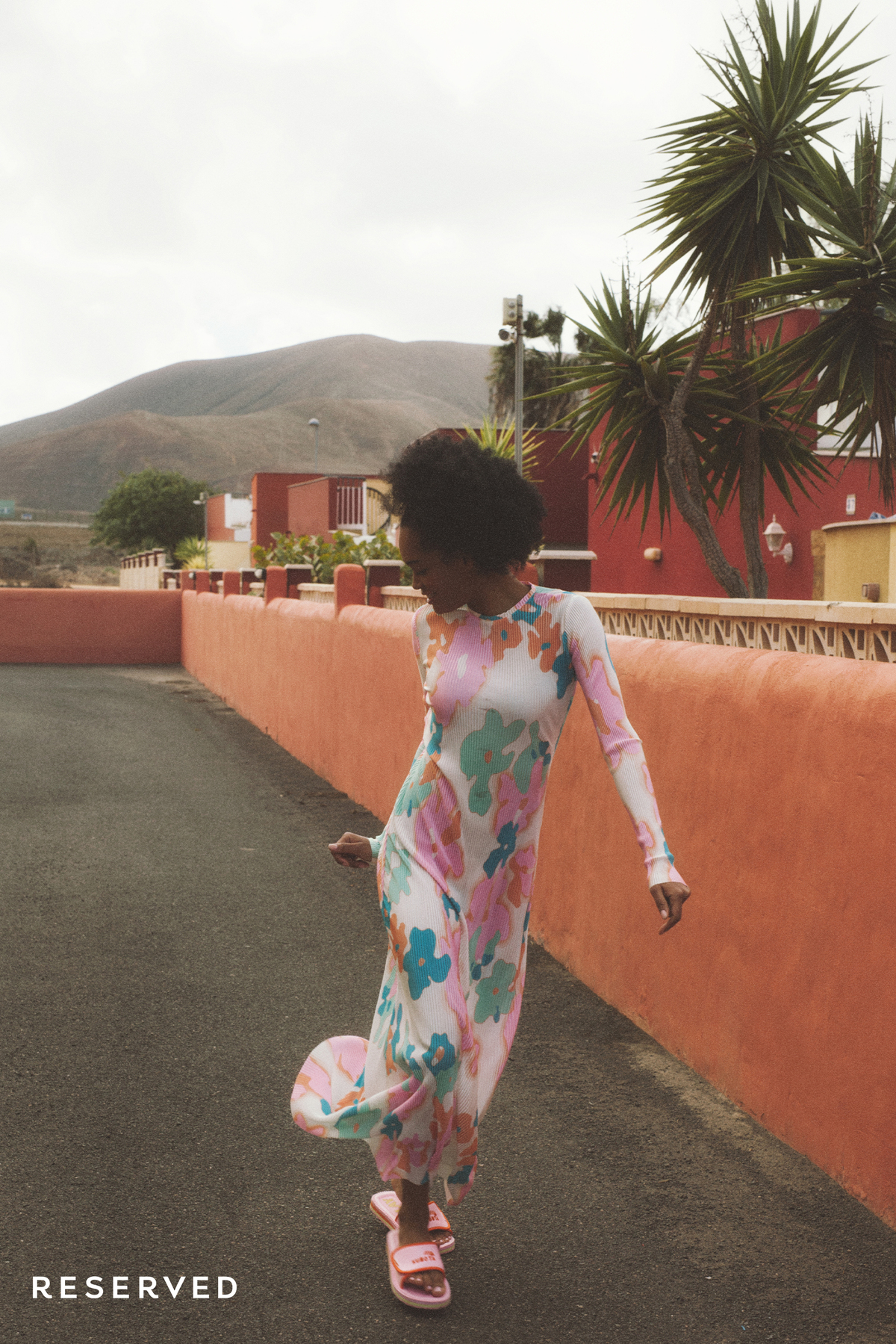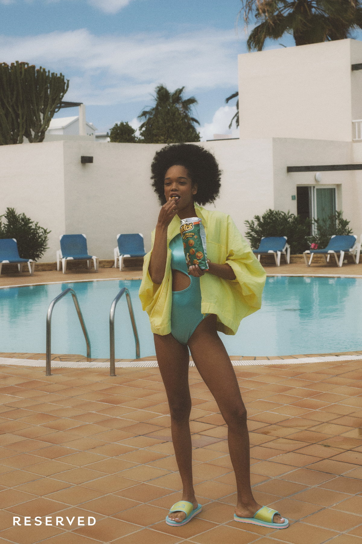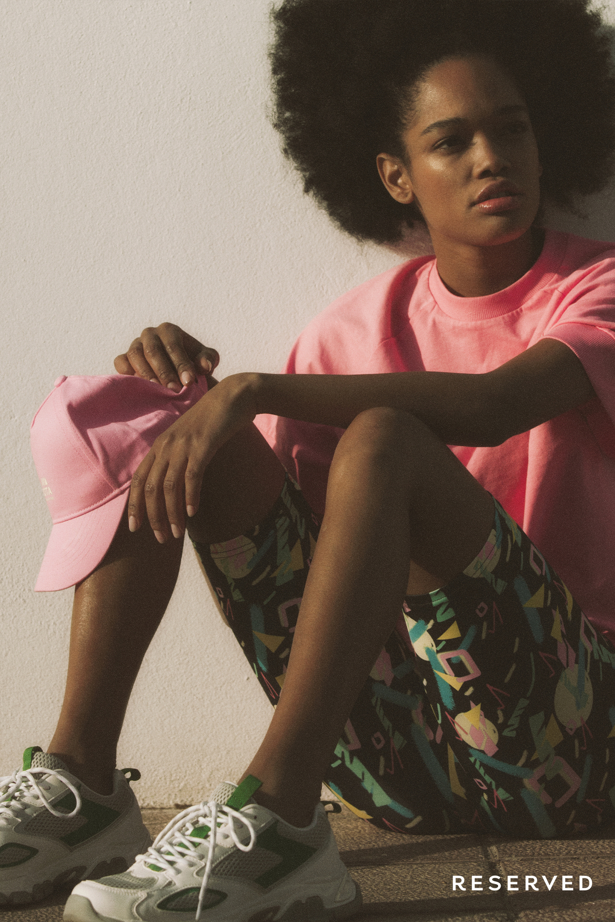 Punkt wyjścia? Oczywiście najbardziej klasyczny model klapków z szerokim pasem zapinanym na rzepy, obszytym lamówką, ozdobionym charakterystycznym logo w dwóch wersjach kolorystycznych: różowo-pomarańczowej i turkusowo-żółtej z napisem Let’s Play na wewnętrznej stronie podeszwy. Kolekcja zawiera oversize’owe t-shirty, dresowe komplety, bezrękawnik ze stójką, czapkę z daszkiem i skarpetki. To słodkie, soczyste, charakterystyczne dla lat dziewięćdziesiątych odcienie gumy balonowej, flamastrów lub pachnących nowością szkolnych piórników. Hasło „Let’s Play” nawiązuje do podwórkowych zabaw, takich jak gra w klasy czy skakanie przez gumę. Logo obecne na dresach jest wykonane specjalną techniką print, dającą ciekawy, trójwymiarowy efekt.