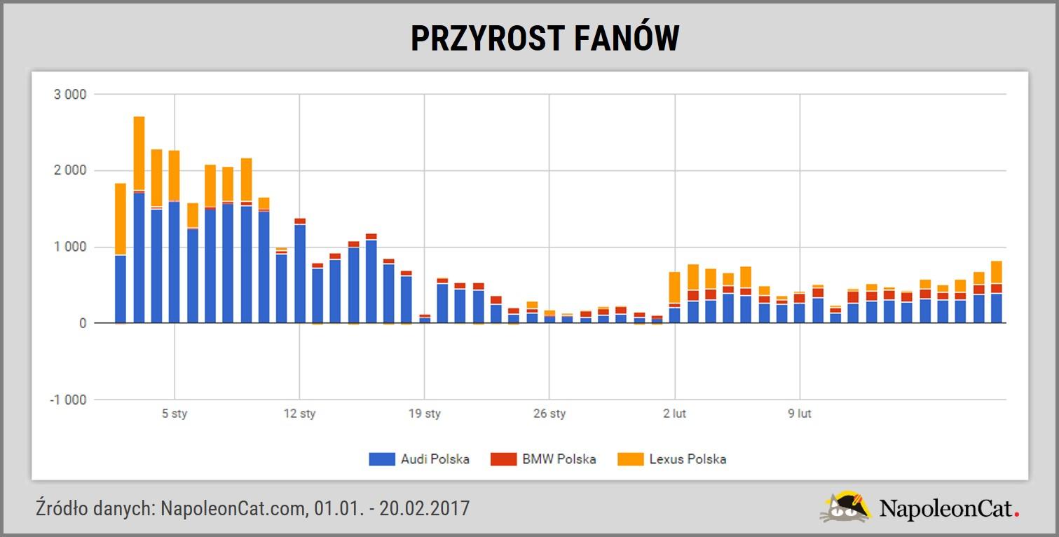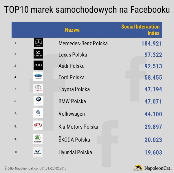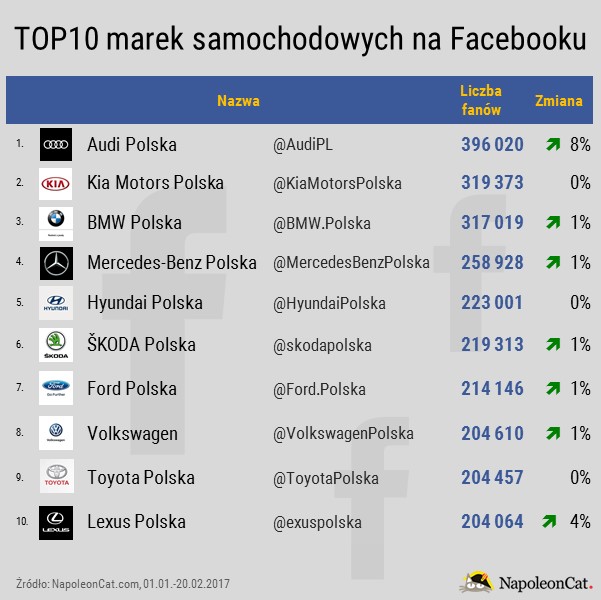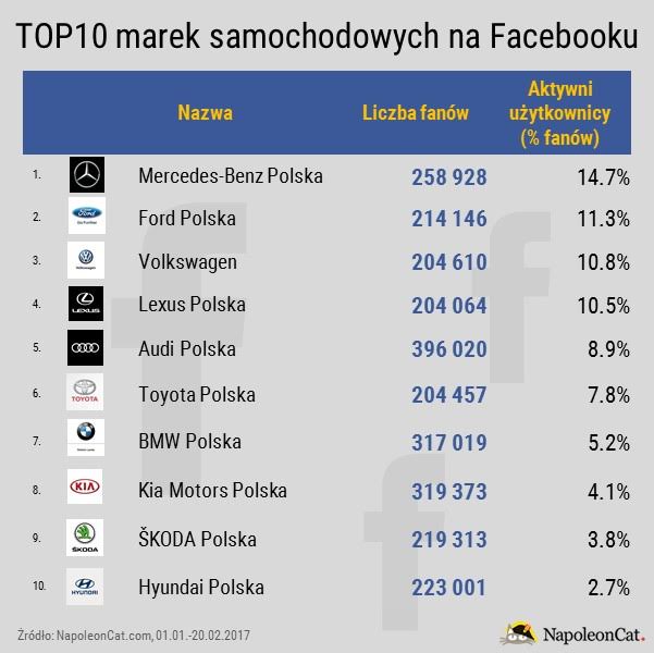Do najpopularniejszych marek na Facebooku należą Audi, Kia Motors oraz BMW. Każda z nich ma już ponad 300 tys. fanów, przy czym Audi zbliża się do liczby 400 tys. To właśnie miłośników tej marki przybyło najwięcej od początku 2017 (wzrost liczby fanów na poziomie 8%). Na drugim miejscu pod kątem przyrostu fanów plasuje się Lexus, zaś na trzecim – BMW Polska.