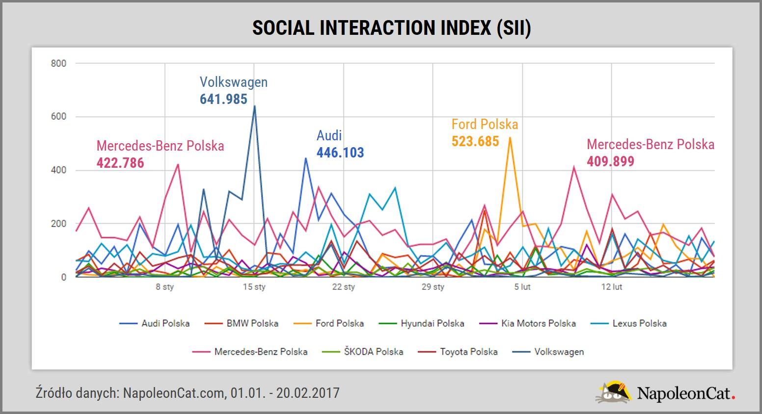 Kolejnym istotnym wskaźnikiem jest Social Interaction Index (SII), który pokazuje siłę interakcji użytkowników Facebooka ze stroną. Bierze on pod uwagę posty, komentarze, reakcje i udostepnienia na analizowanej stronie, jak również wspomnienia o niej dokonane przez inne strony lub użytkowników. SII pozwala bezpośrednio porównać strony o różnej wielkości. Najwyższy wskaźnik SII uzyskały strony marek: Mercedes-Benz, Lexus oraz Audi.