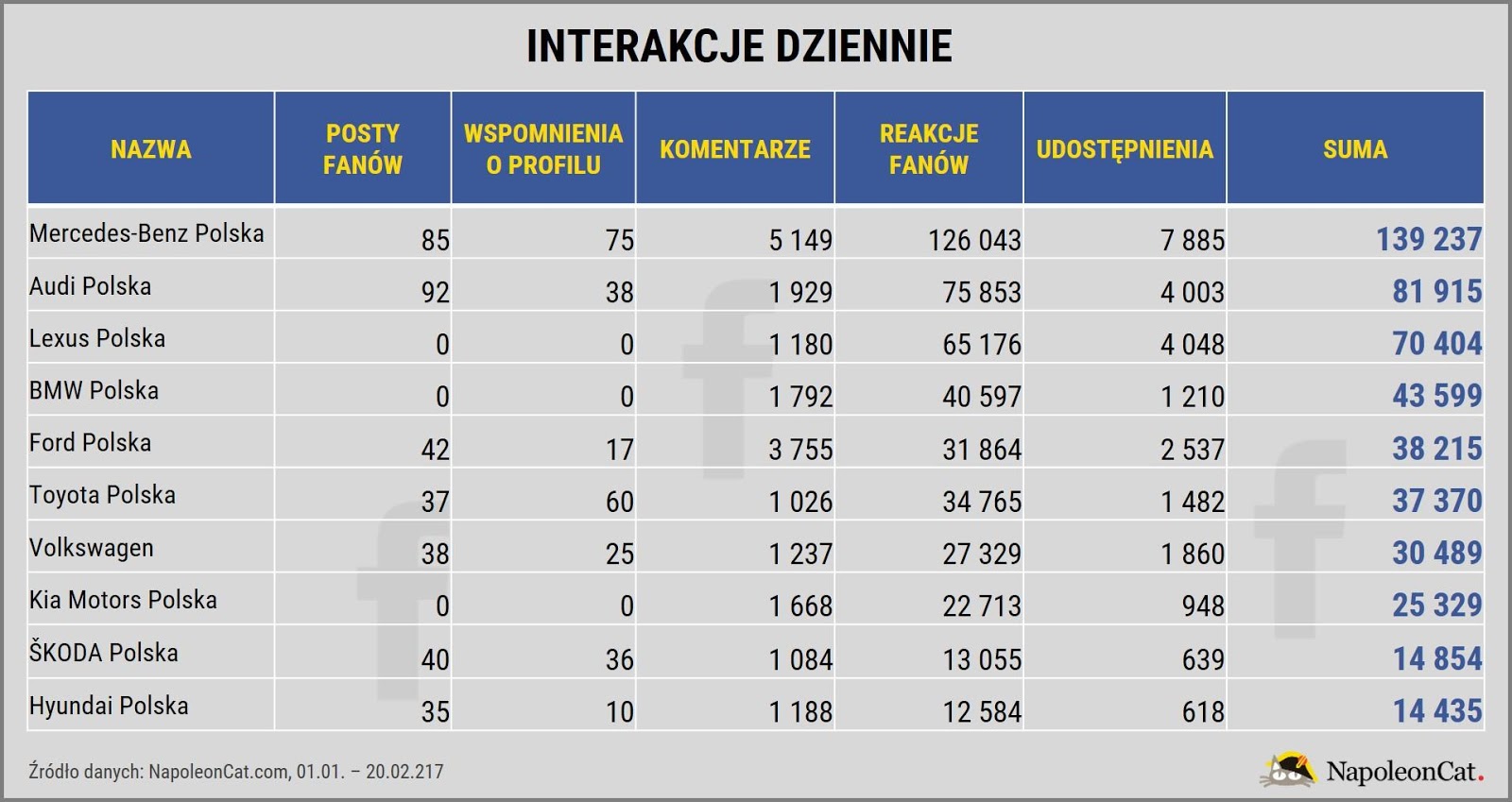 Od początku tego roku najwięcej interakcji (suma reakcji, komentarzy, udostępnień oraz wzmianek i postów dodanych przez użytkowników) wywołały strony Mercedesa, Audi oraz Lexusa.