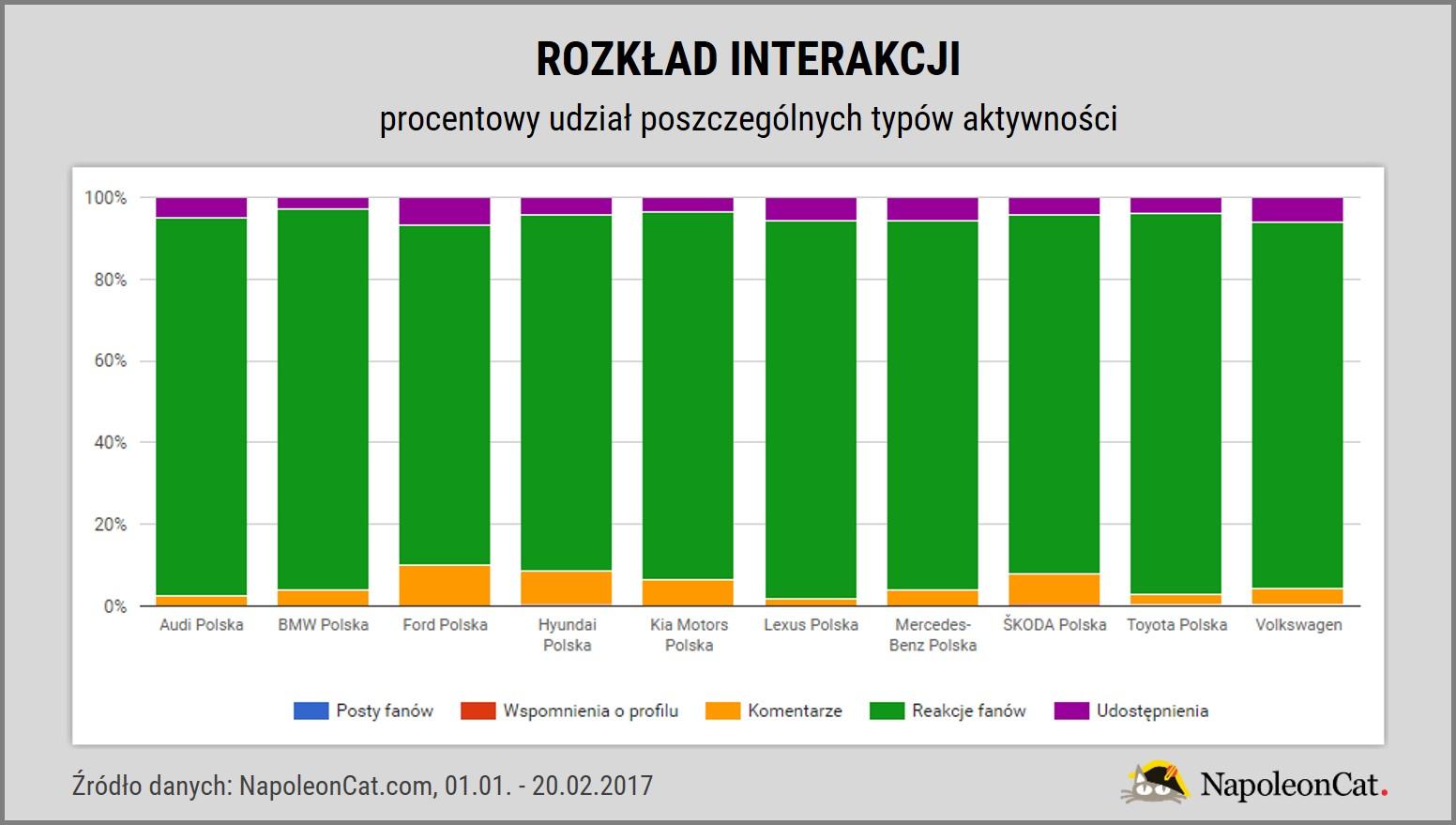 Najczęściej wykonywanymi interakcjami były reakcje fanów (Lubię to, Uwielbiam, Ha Ha itp.). Znacznie rzadziej natomiast pojawiały się komentarze, czy udostępnienia.