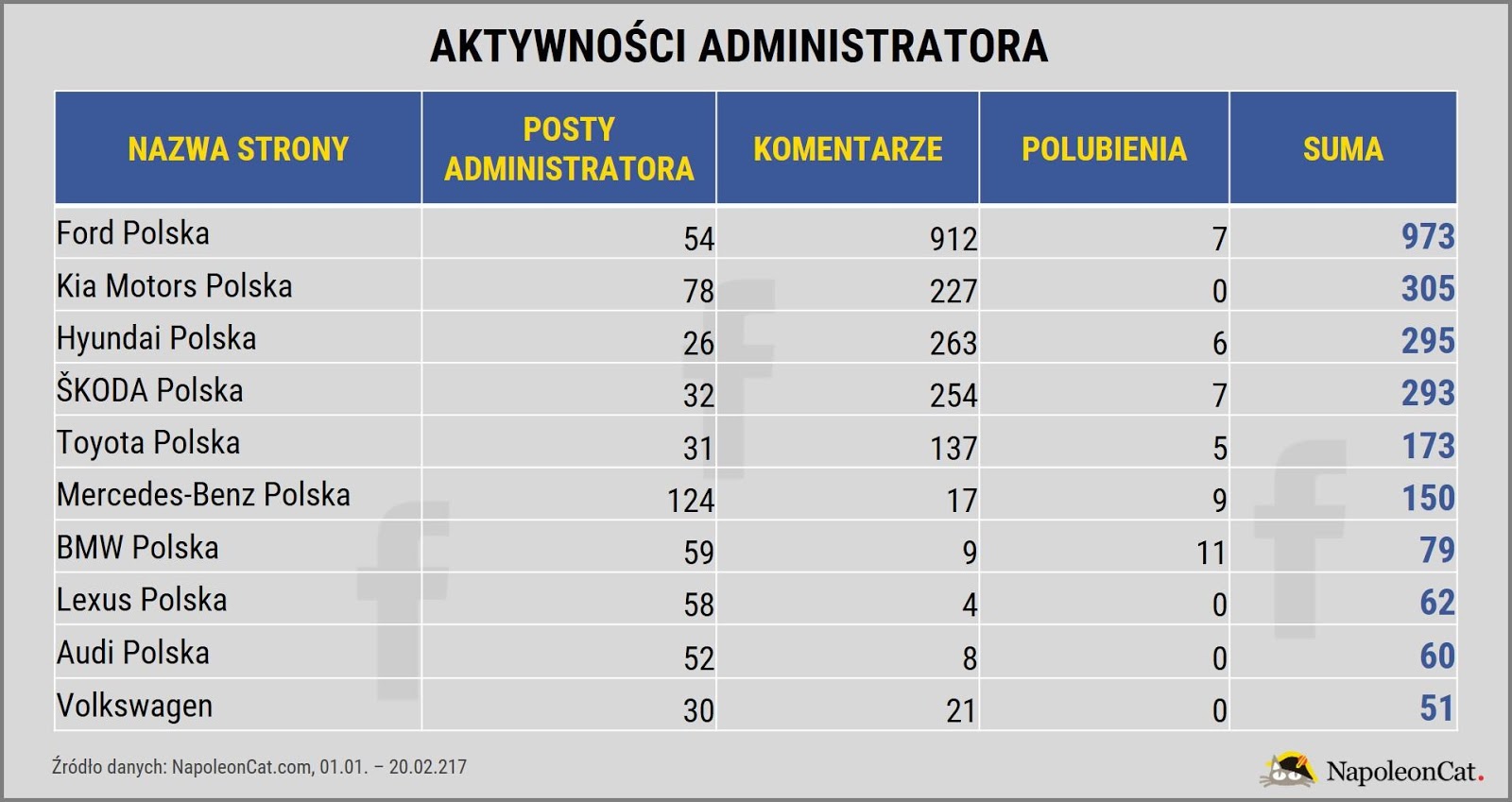 NapoleonCat sprawdził również, które marki wykazują się największą aktywnością na własnych stronach. W tej kategorii zdecydowany prym wiedzie Ford, wyprzedzając marki Kia i Hyundai. Warto tutaj zwrócić uwagę na fakt, iż te marki wcale nie publikują najwięcej postów, ale angażują się w dialog ze swoimi fanami. Najwięcej na swoich stronach opublikowali natomiast Mercedes oraz Kia.