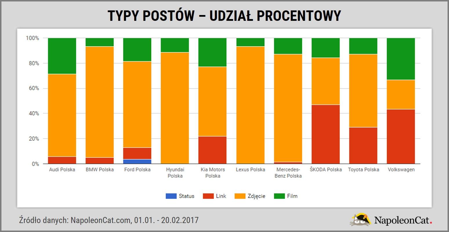 Na stronach marek motoryzacyjnych najczęściej publikowane są posty ze zdjęciem, filmem lub te, zawierające link.
