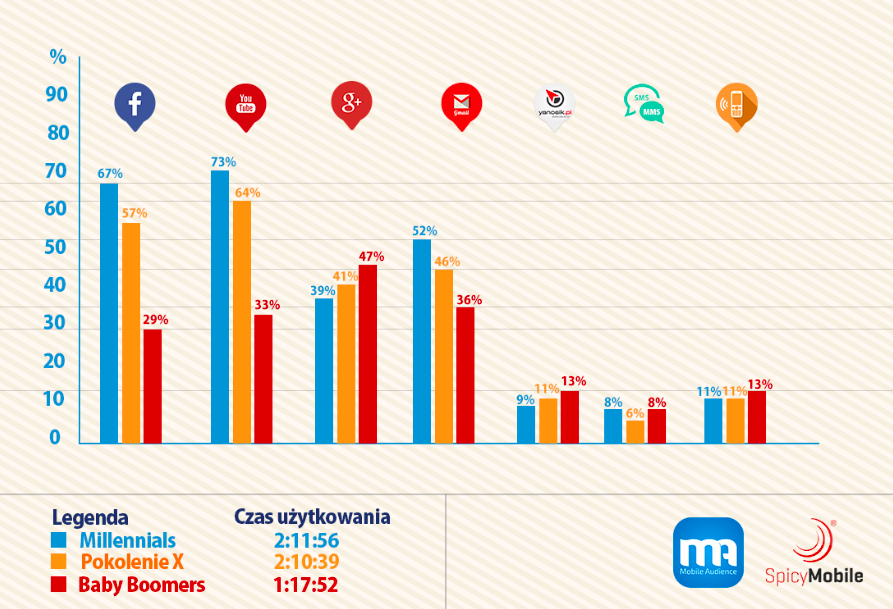 Pokolenie Millennials chętnie korzysta z portali społecznościowych (Facebook 67%). Dla porównania w grupie 50-latkow najpopularniejszą aplikacją jest Google+ z zasięgiem 47%. To zaskakujące, gdyż pokolenie to nie wychowywało się w dobie technologii, a tym bardziej portali społecznościowych. Wyjaśnieniem, może być jednak fakt, że przy zakładaniu poczty gmail.com automatycznie zakładanej jest konto Google +.