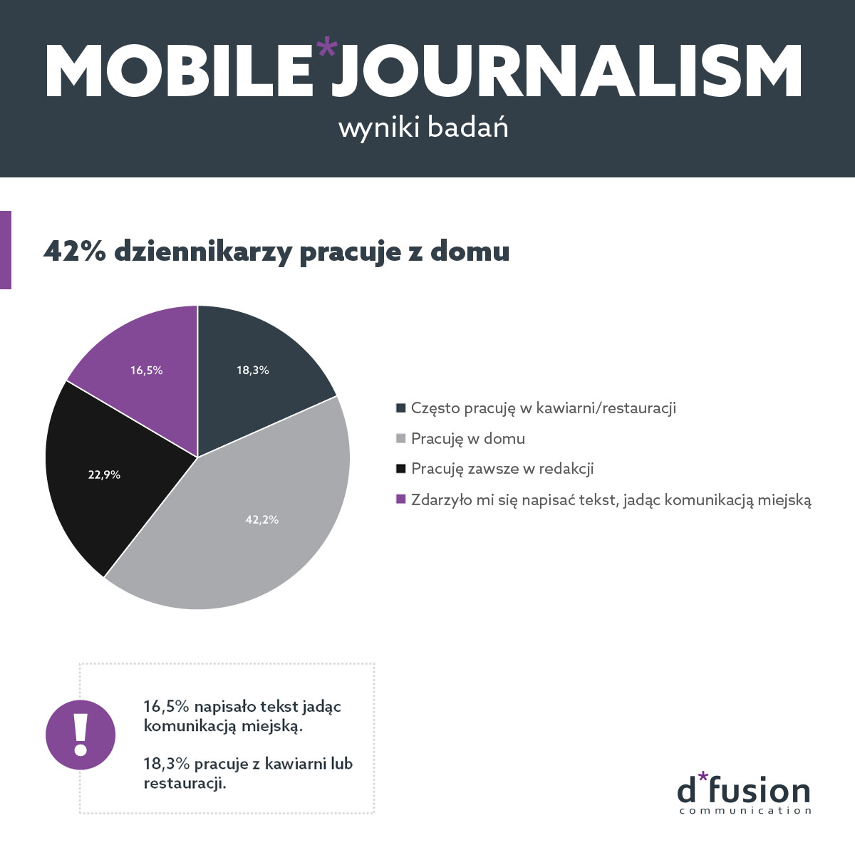 Mobilne urządzenia to możliwość mobilnej pracy. Badanie ,,Mobile Journalism” wskazuje, że zaledwie 23 proc. ankietowanych wykonuje swoje zadania wyłącznie w redakcji. Prawie połowa przyznaje, że pracuje z domu, a 18 proc. w kawiarni lub restauracji. Coraz lżejsze i poręczniejsze urządzenia sprawiły, że 17 proc. respondentów zdarzyło się „redakcyjne biurko” zastąpić własnymi kolanami, pisząc tekst w…. komunikacji miejskiej. Dziennikarze coraz większą rolę przypisują smartfonom. Prawie 90 proc. docenia, że działają sprawnie i są zawsze pod ręką, a dla ponad 1/4 istotna jest możliwość połączenia z Internetem dzięki czemu mogą o dowolnej porze dnia zajrzeć do skrzynki pocztowej i zweryfikować nadesłane treści oraz zrobić szybki research w sieci. Smartfon wykorzystywany jest przez dziennikarzy jako narzędzie do robienia zdjęć ze spotkań i konferencji (jak wskazuje 73 proc. ankietowanych), rejestracji wywiadów (52 proc.), a także do… tworzenia tekstów. Aż połowa badanych przyznała, że chociaż raz napisała materiał prasowy na swoim telefonie.